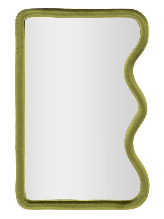 Oglinda cu forma neregulata si rama verde din catifea. Textura deosebita si design fluid pentru o energie pozitiva in orice incapere.