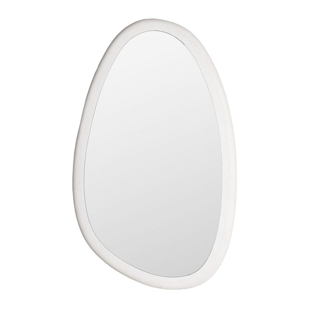 Rama albă, cu muchii moi și contur organic, atenuează liniile rigide ale mobilierului și, în același timp, creează o prezență sculpturală pe perete. Sticla generoasă reflectă lumina naturală, amplificând vizual spațiul, în timp ce versatilitatea montajului permite integrarea oglinzii atât deasupra unei console, cât și pe verticala unui dressing.