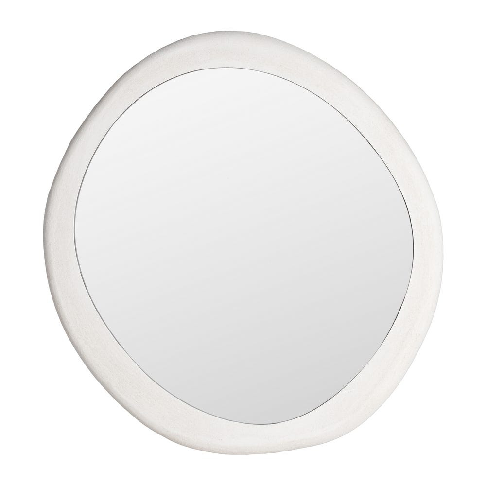 Oglindă albă din MDF cu sticlă formă organică pentru hol, dormitor sau living, care luminează spațiul și, totodată, aduce o notă modernă prin conturul rotunjit, ușor asimetric, inspirat de pietrele de râu.