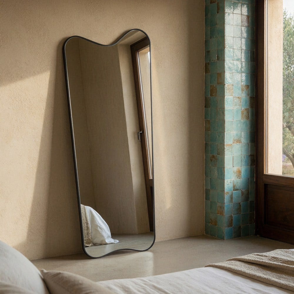 Această oglindă decorativă este concepută ca piesă de impact pentru dormitoare, holuri sau zone de dressing, remarcându-se prin forma sa organică și silueta verticală elegantă. Conturul fluid adaugă dinamism vizual și contribuie la crearea unui ambient contemporan, echilibrat și luminos.
