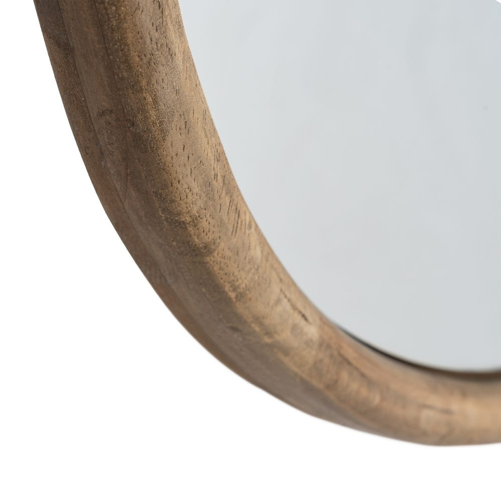Rama din lemn urmărește o linie neregulată, cu margini rotunjite, care evidențiază caracterul organic al oglinzii. Suprafața din cristal este generoasă și bine proporționată, oferind atât funcționalitate, cât și un rol decorativ clar în amenajare.