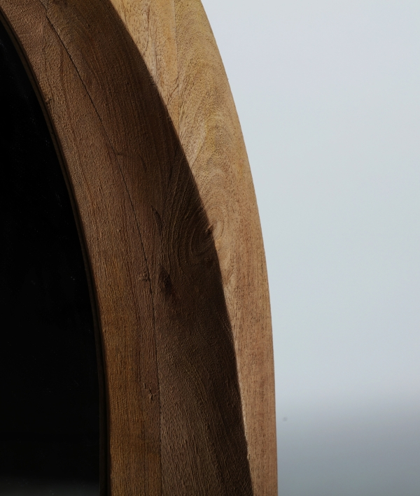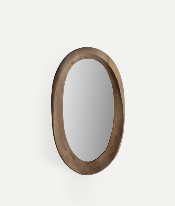 Oglinda SJELD de la KODU aduce naturalețea și autenticitatea lemnului masiv în centrul atenției. Cu o ramă ovală sculptată manual din lemn de mango, fiecare piesă este unică, prezentând variații subtile de textură și culoare. Designul său organic și forma fluidă transformă orice spațiu într-un loc cald, elegant și echilibrat vizual.