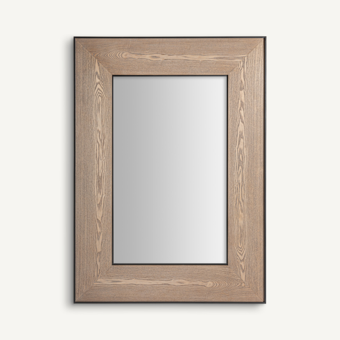 Cadrul lat de 27 cm pune în valoare suprafața oglindă într-un registru arhitectural, în timp ce detaliul din fier negru marchează marginile cu un contrast discret, accentuând linia geometrică a piesei. Combinația dintre textura frasinului și accentele metalice creează o tonalitate caldă, potrivită pentru ambientele care caută echilibru între eleganță și rigoare constructivă.