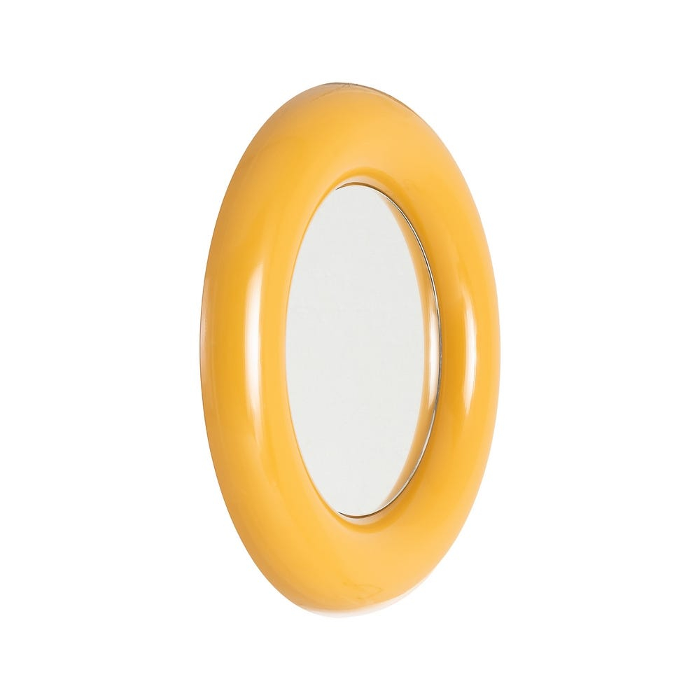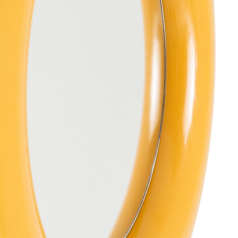 Oglindă rotundă din metal muștar pentru perete cu ramă volumetrică lucioasă și look modern, ideală pentru a anima vizual un perete de living, hol sau dormitor și pentru a amplifica lumina din încăpere prin reflexia suprafeței centrale.