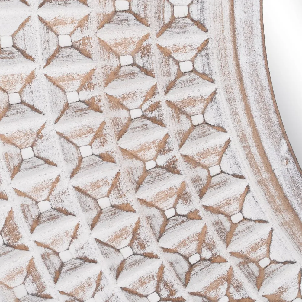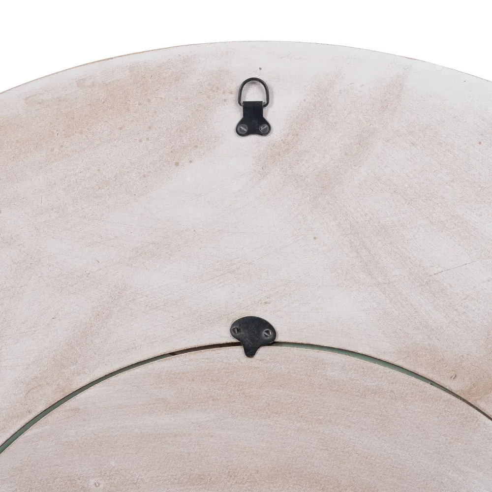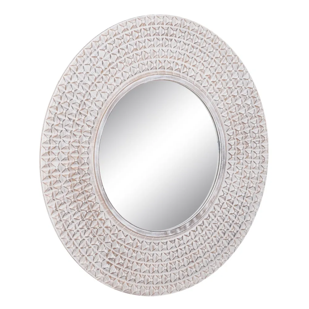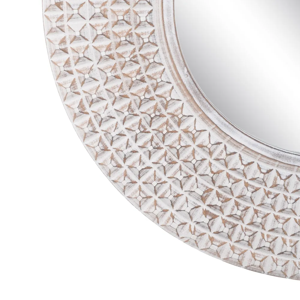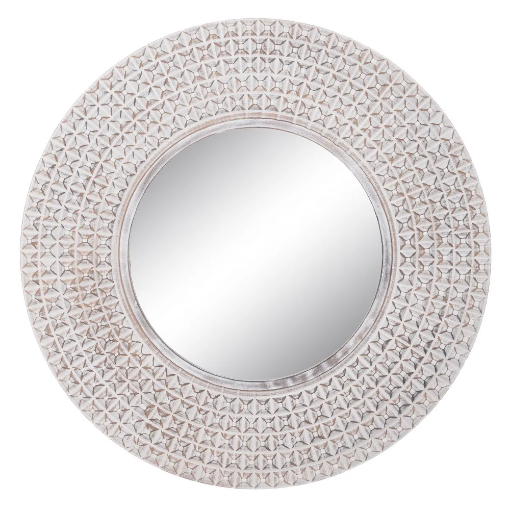 Adaugă un element de farmec rustic și boem cu această oglindă rotundă din MDF, stil boho chic și modern-rustic. Caracterizată de o ramă sculptată cu finisaj alb uzat, această oglindă oferă un echilibru perfect între tradițional și contemporan. Ideală pentru a înfrumuseța holuri, dormitoare sau livinguri, oglinda se integrează armonios în diverse tipuri de decor, de la cele boeme la cele moderne. Completează-ți decorul cu această piesă deosebită și creează un ambient cald și primitor în casa ta.