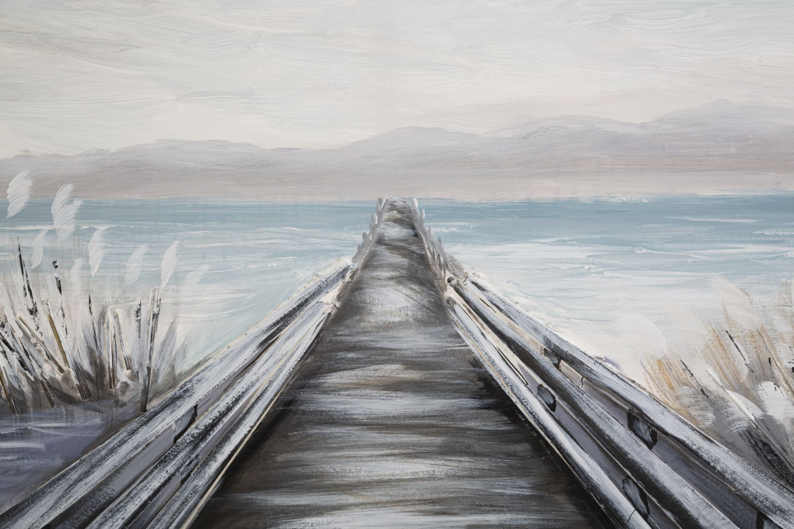 Adăugați o perspectivă deosebită și o notă de liniște în decorul dvs. interior cu acest tablou pictat manual pe pânză de 120 cm lățime și 80 cm înălțime. Opera de artă înfățișează un pod rustic care se întinde către un orizont vast, invitând la reflecție și calm. Nuanțele de albastru și gri ale apei și cerului, împreună cu detalii texturate ale stufărișului, aduc un suflu de natură și spațiu în orice cameră. Este o piesă ideală pentru living-uri sau birouri, oferind o evadare vizuală către serenitate și frumusețea naturală neîngrădită.