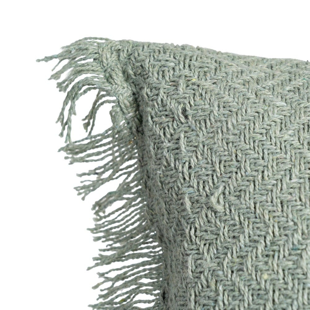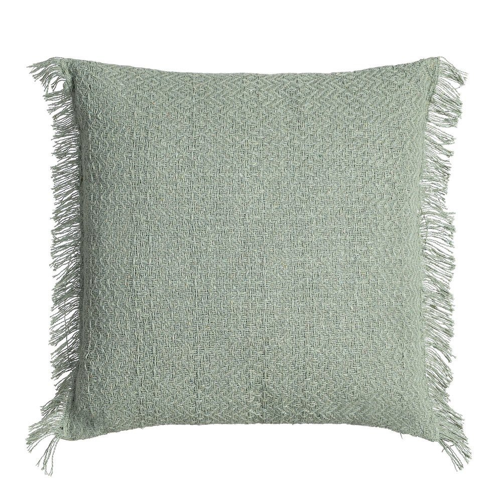 Forma pătrată este evidențiată de franjuri dispuse pe margini, detaliu care adaugă dinamism și pune în valoare textura materialului. Țesătura prezintă un aspect discret, ușor neregulat, care contribuie la expresivitatea vizuală a pernelor.