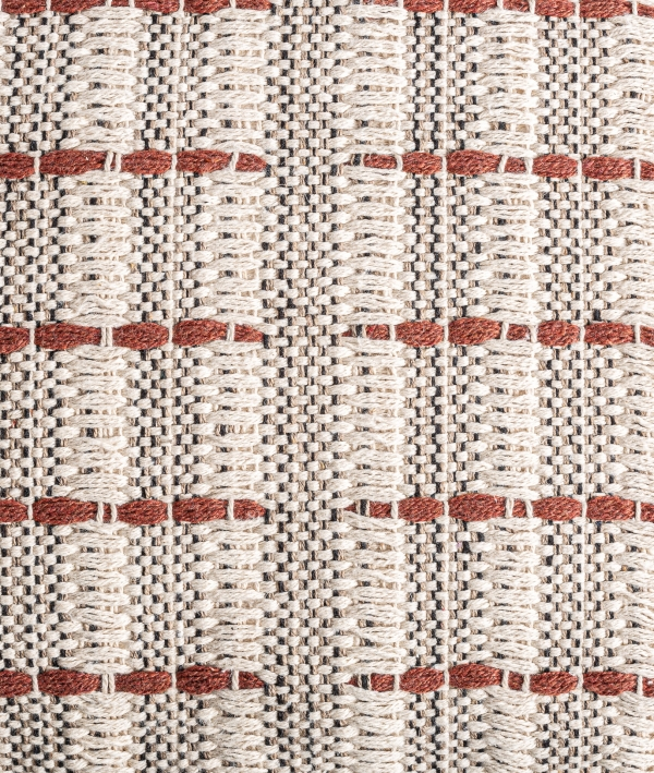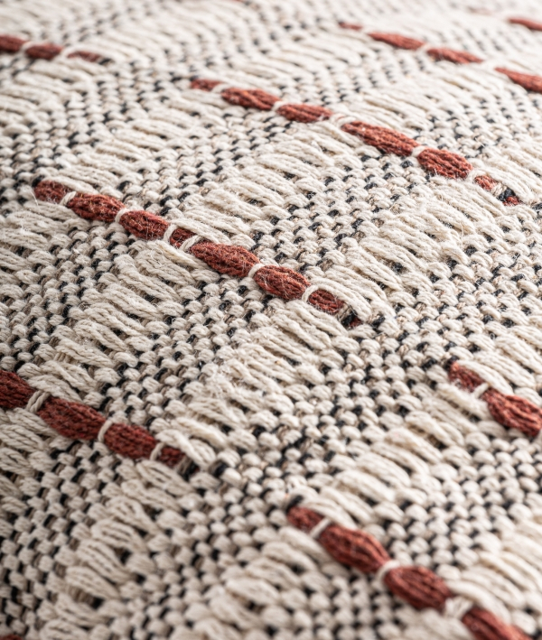 Pernă Keale se remarcă prin textura sa naturală din iută și modelul discret în nuanță de teracotă, oferind un aspect cald și artizanal. Fibrele dense și vizibile creează o suprafață tactilă plăcută, perfectă pentru a adăuga profunzime vizuală într-un decor modern sau rustic.