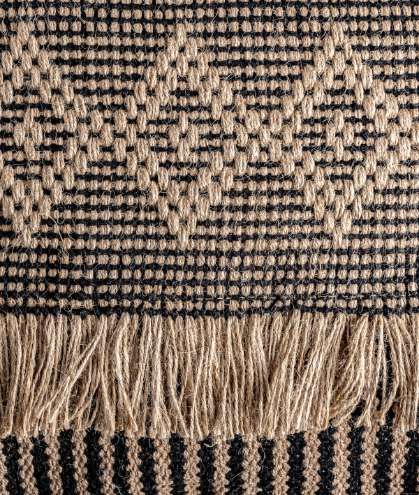 Pernă Blahir se remarcă prin țesătura împletită bogată în detalii, completată de franjurile decorative care aduc un plus de autenticitate și dinamism vizual. Modelul geometric inspirat din motive etnice conferă profunzime, iar combinația cromatică de maro deschis și negru creează un contrast natural și elegant.