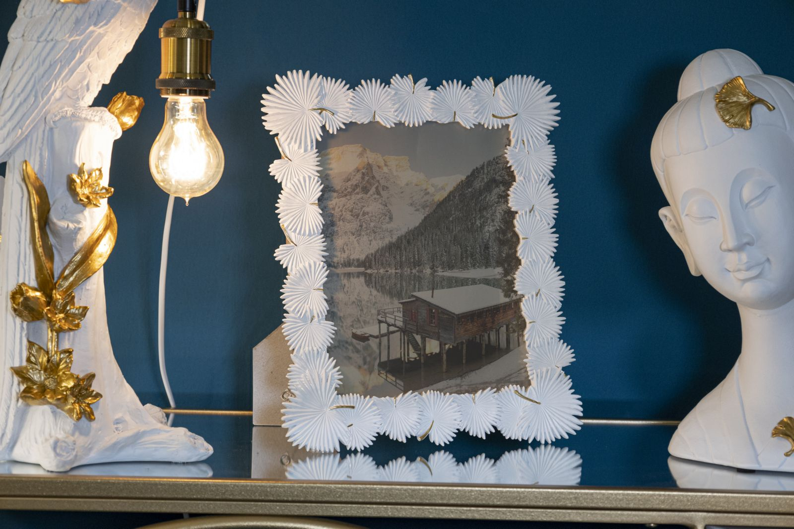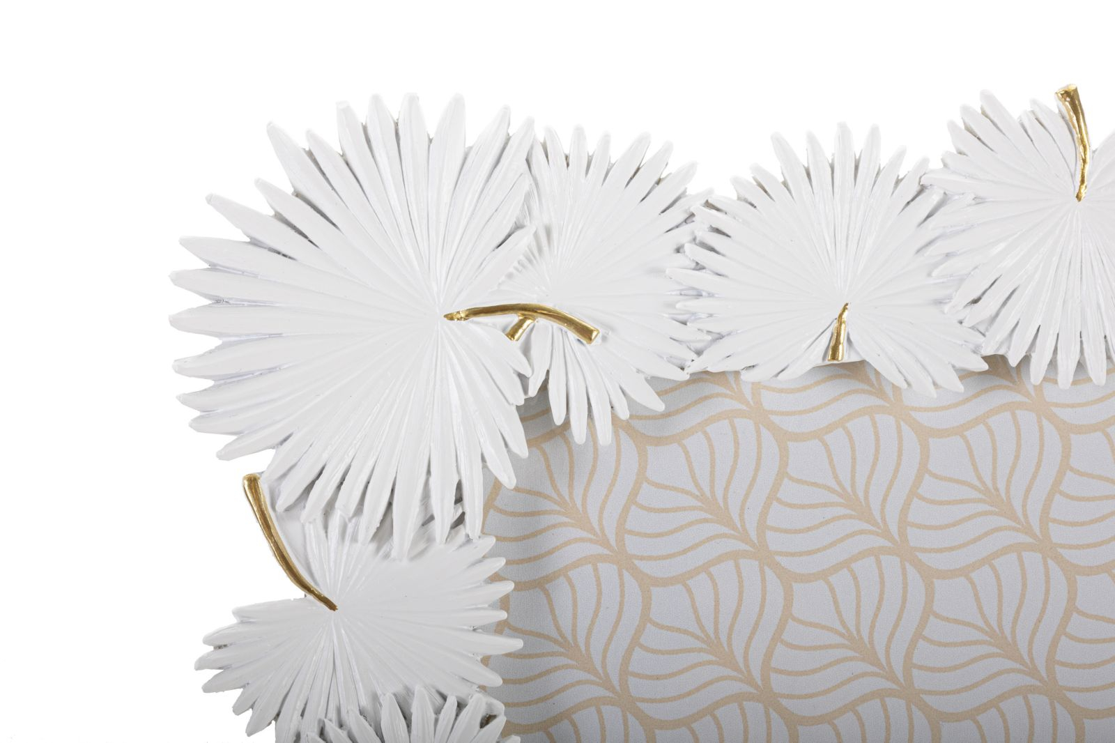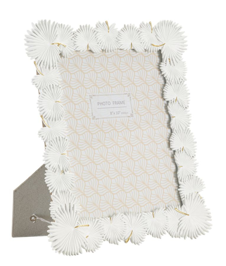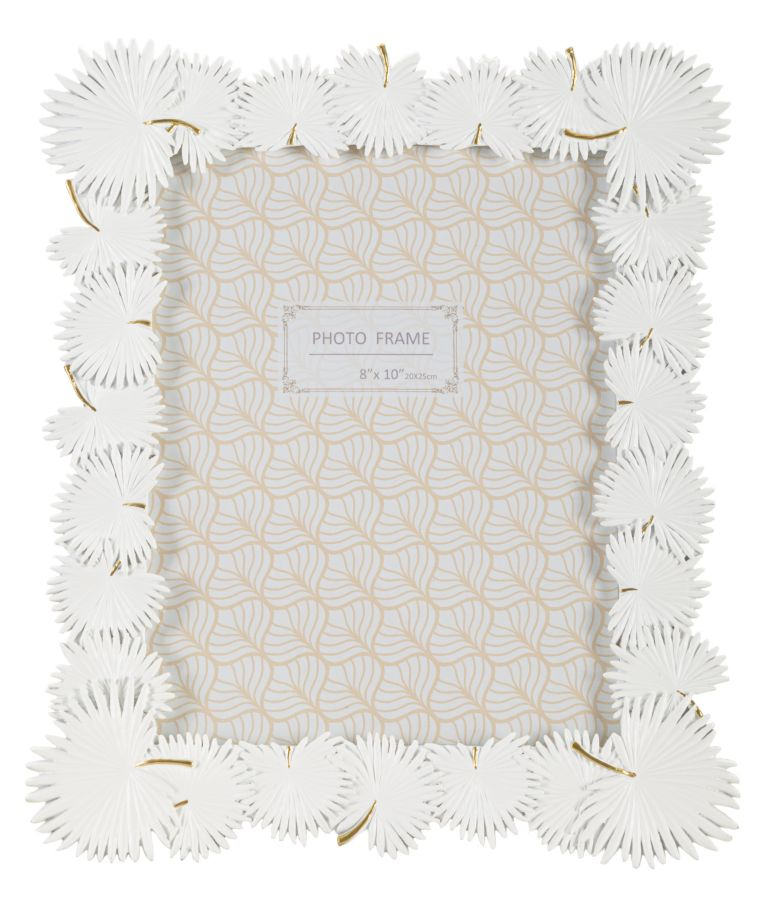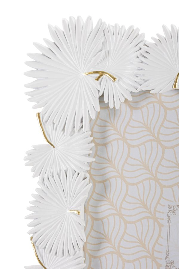Aspectul acestei rame este exotic, zeci de frunze de palmier realizate în relief, cu mare atenție la detalii, înconjoară fotografia. Albă cu accente finuțe de auriu. Materiale : rășină și sticlă
