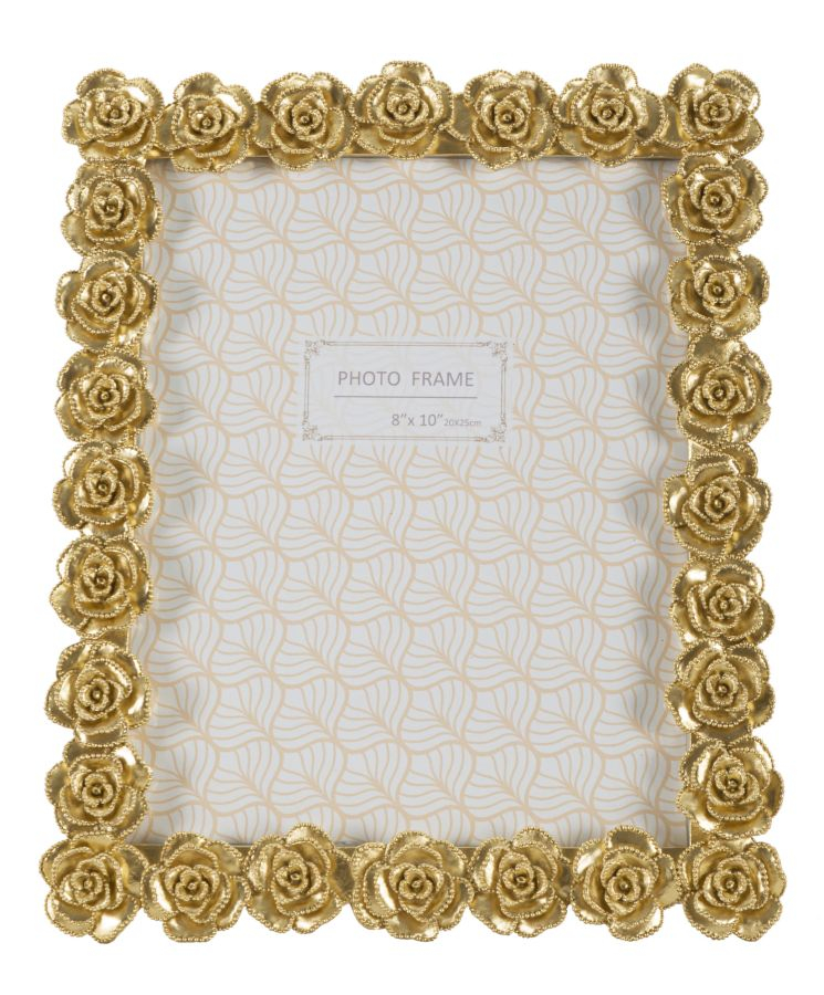 Rama foto trandafiri aurii, cu dimensiunile 25,5x2,5x31 cm și dimensiune internă 20x25 cm, învăluie fotografia cu trandafiri realizați cu măiestrie. Această ramă, construită din rășină și sticlă, adaugă eleganță și rafinament oricărui spațiu. Această ramă foto este ideală pentru a adăuga un element de lux și stil casei tale, fiind potrivită pentru orice stil de amenajare interioară. Materiale: rășină și sticlă.