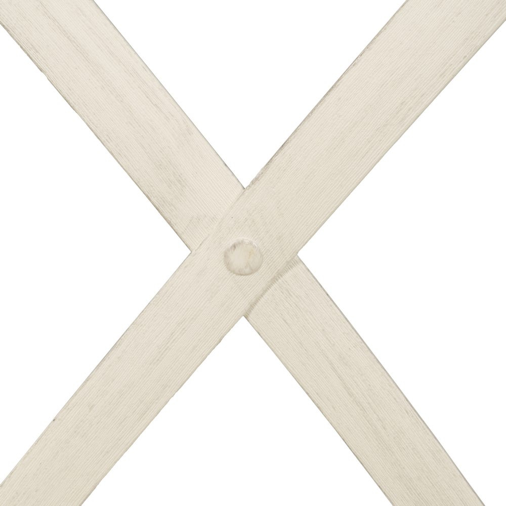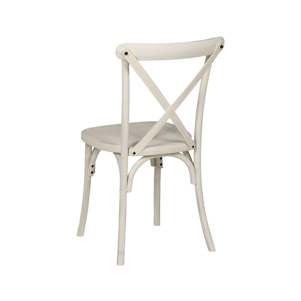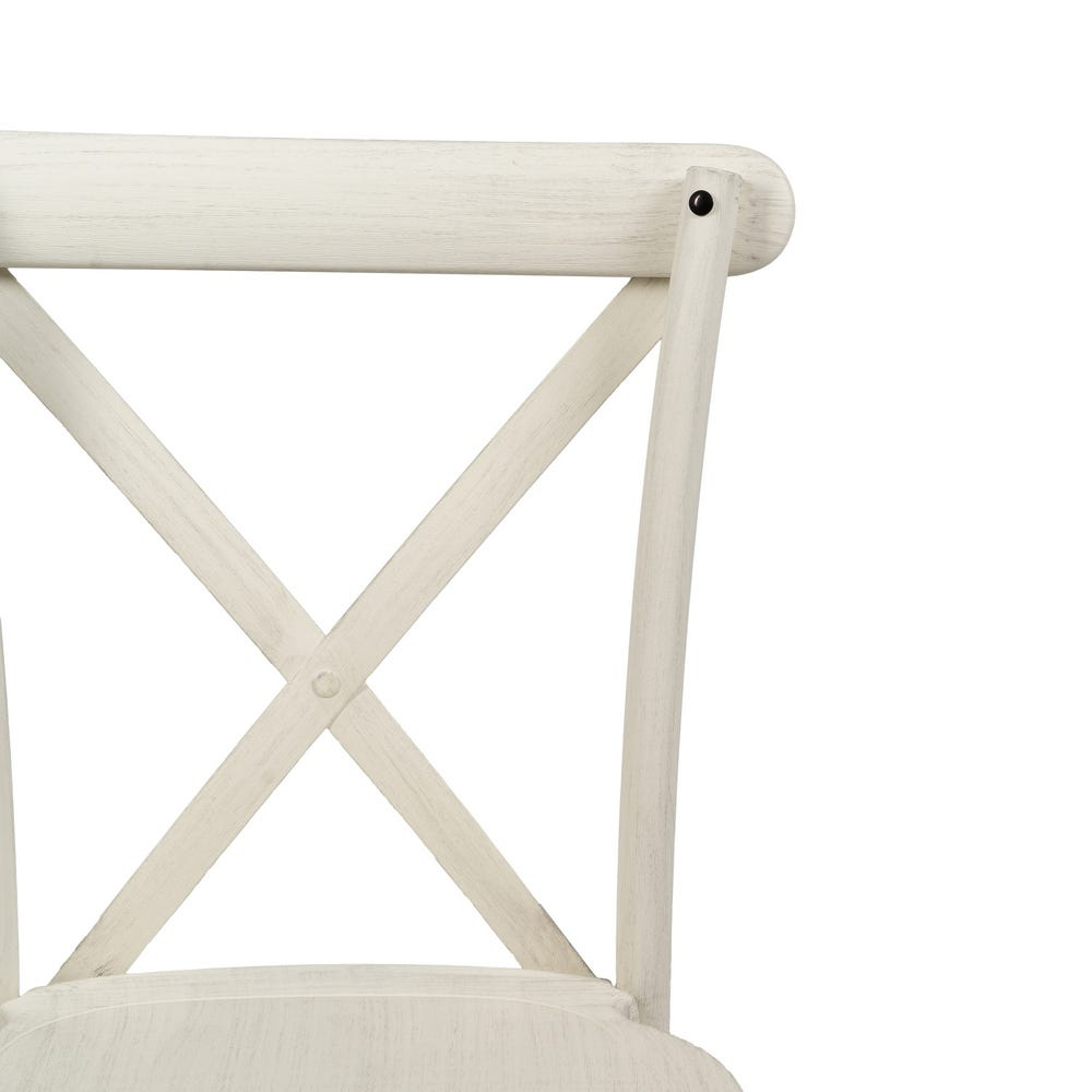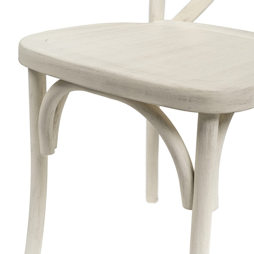 Scaunele se evidențiază prin spătarul cu traversă în X, un detaliu decorativ care oferă un aspect clasic și echilibrat, potrivit pentru interioare în stil rustic modern, mediteranean sau contemporan. Culoarea albă pune în valoare liniile simple și rotunjirile discrete ale structurii, contribuind la un look aerisit și proaspăt.