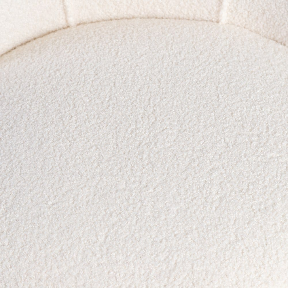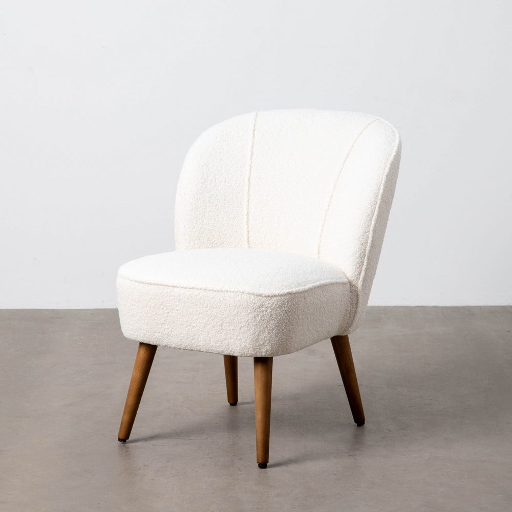 Linia rotunjită a spătarului îmbrățișează confortabil corpul, iar textura crem, tip boucle, este plăcută la atingere. Picioarele conice din lemn de cauciuc adaugă o notă mid-century și ridică vizual volumul, menținând piesa aerisită în decor.