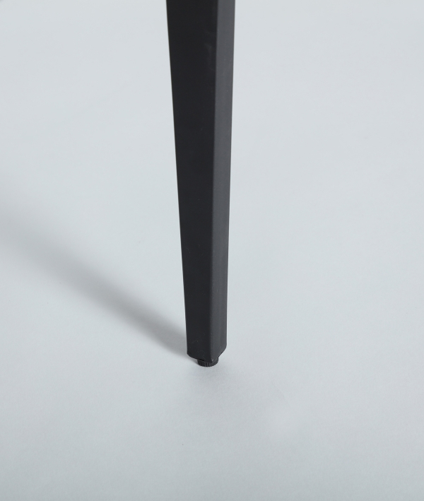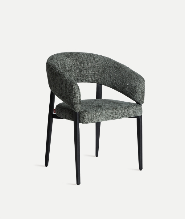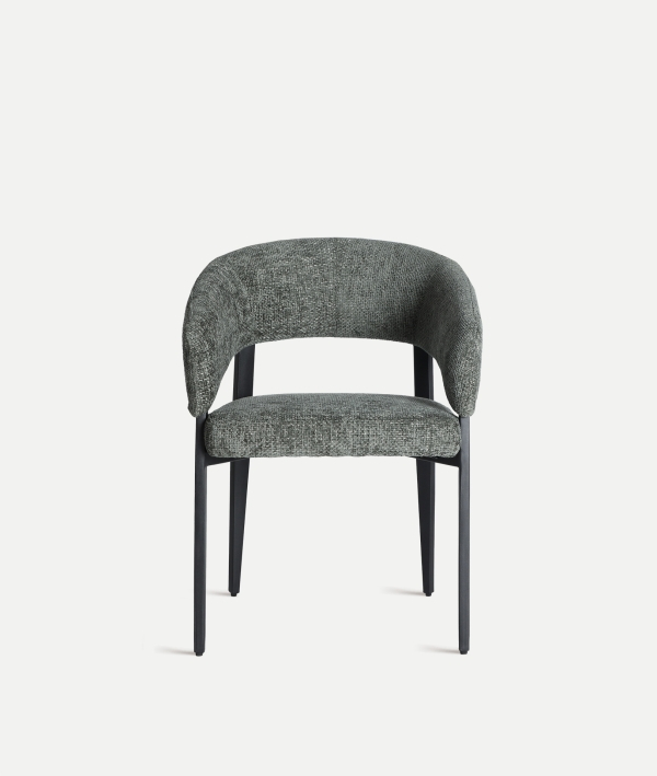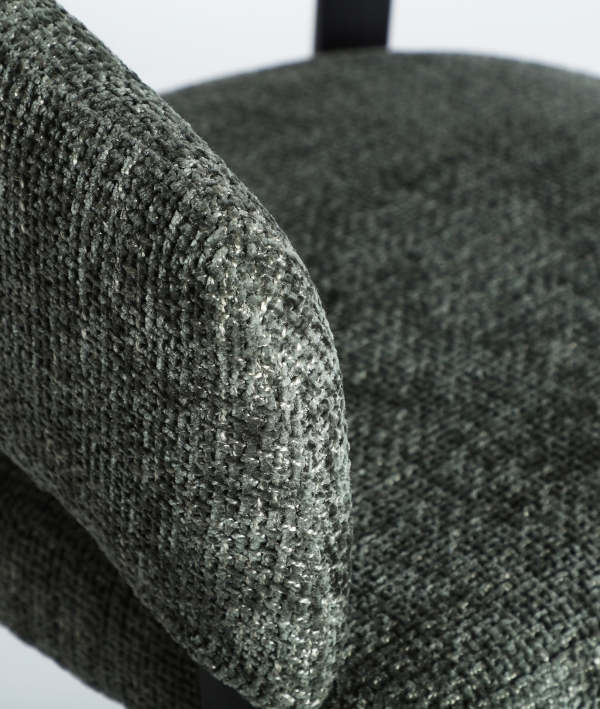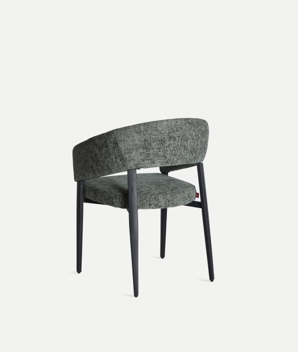 Designul scaunului Bruges pune accent pe forme fluide și confort, unde spătarul curbat îmbrățișează corpul pentru o postură relaxată. Tapițeria texturată gri, cu un efect subtil marmorat, oferă un aer sofisticat, completat de picioarele metalice negre care adaugă stabilitate și contrast elegant.