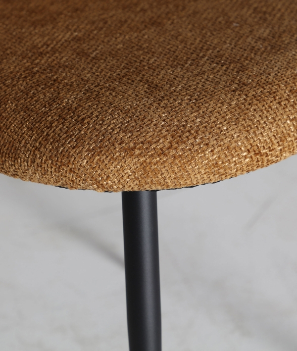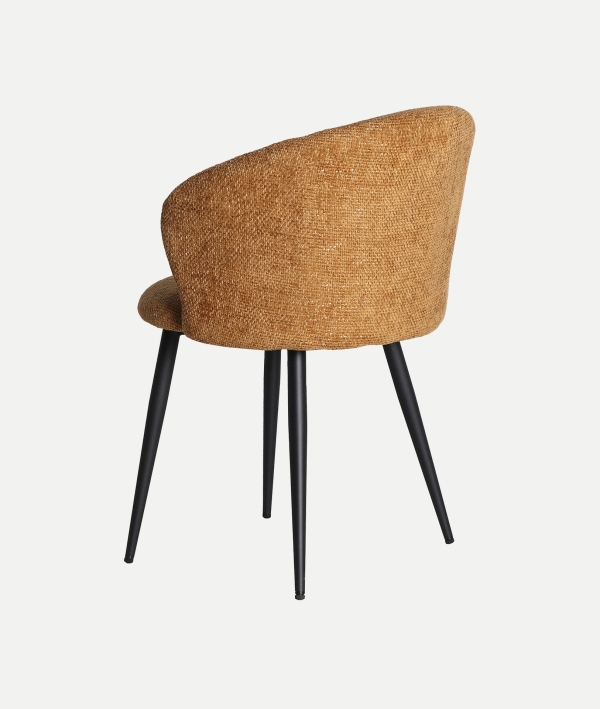 Textura tapițeriei aduce un aspect sofisticat, iar nuanța ocru oferă căldură și stil încăperii. Șezutul moale și spătarul curbat sunt gândite pentru o susținere confortabilă, chiar și în timpul meselor prelungite sau al discuțiilor relaxate. Contrastul dintre picioarele negre și tapițeria luminoasă creează un echilibru vizual plăcut.