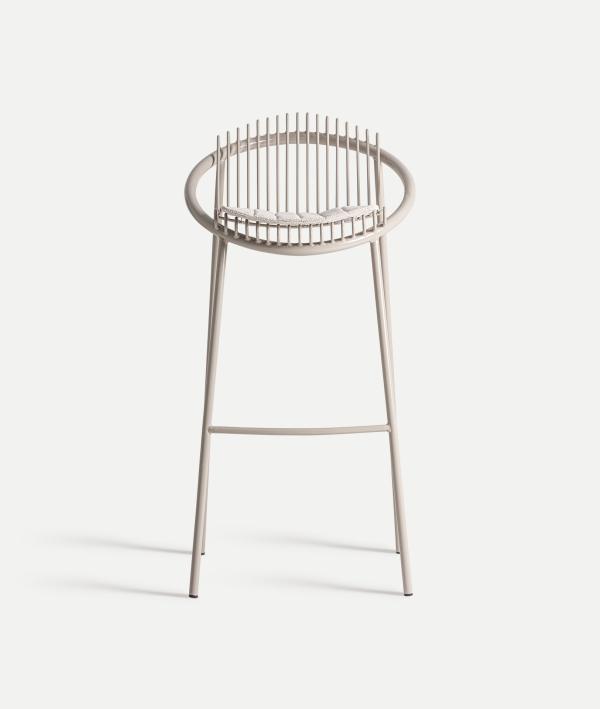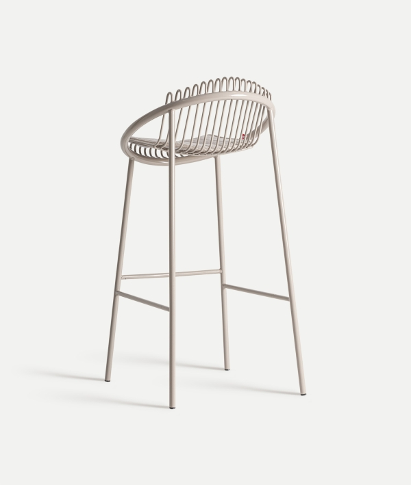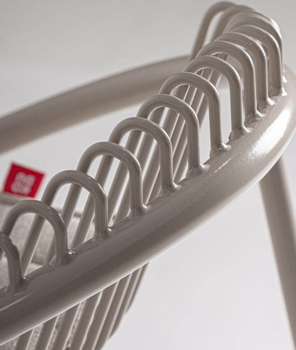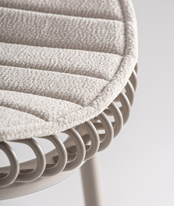 Cadrul este realizat din fier vopsit gri, iar șezutul este completat de o pernă din poliester.
