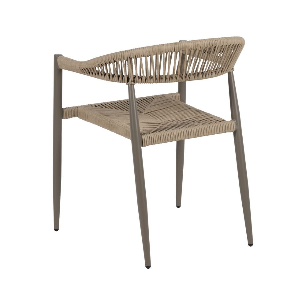 Liniile subțiri ale cadrului metalic susțin o împletitură uniformă care lasă să treacă lumina, accentuând textura bej natural. Brațele continuă elegant curbura spătarului, iar șezutul plat oferă stabilitate în utilizarea zilnică.