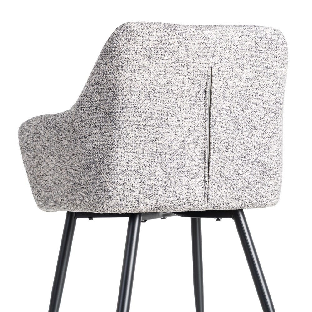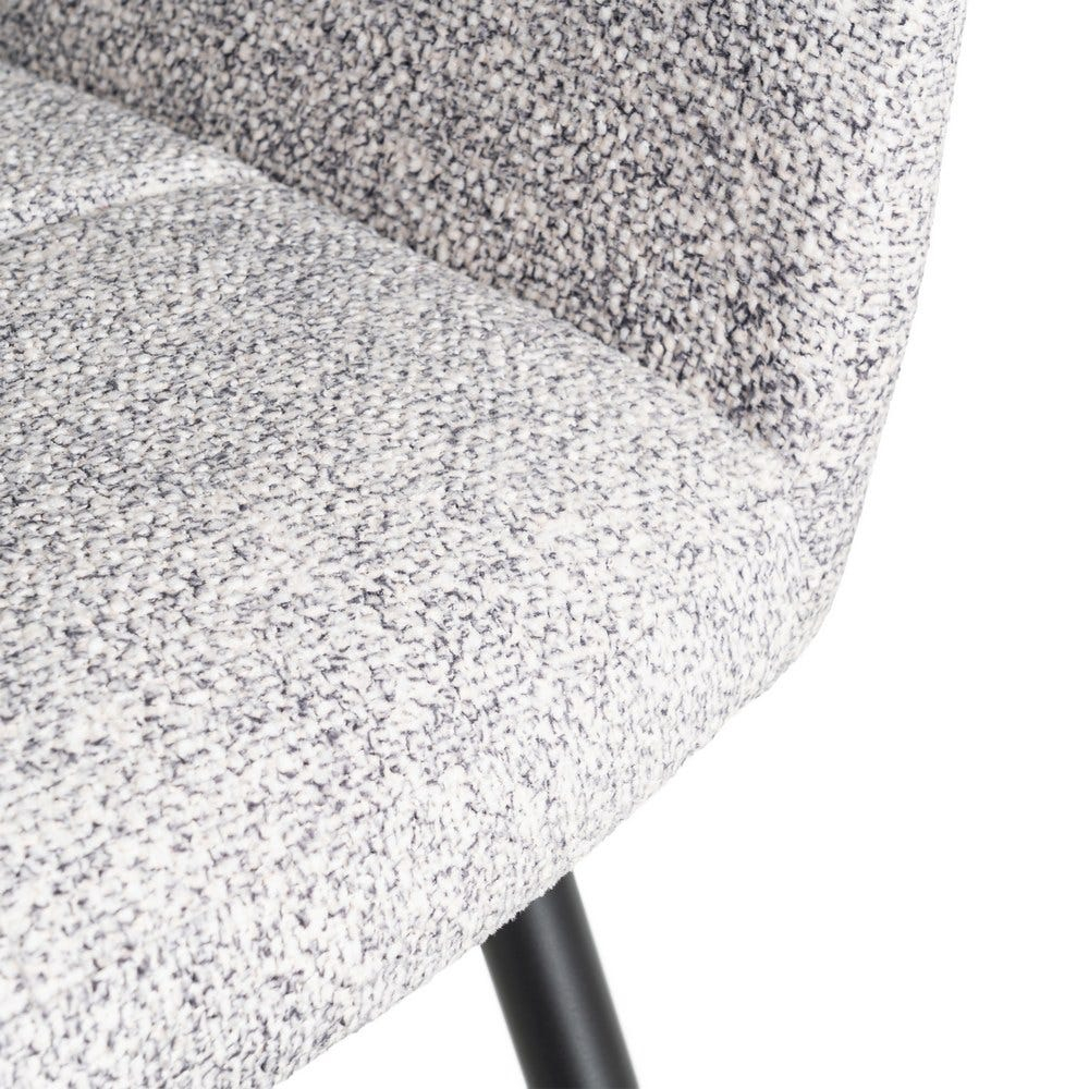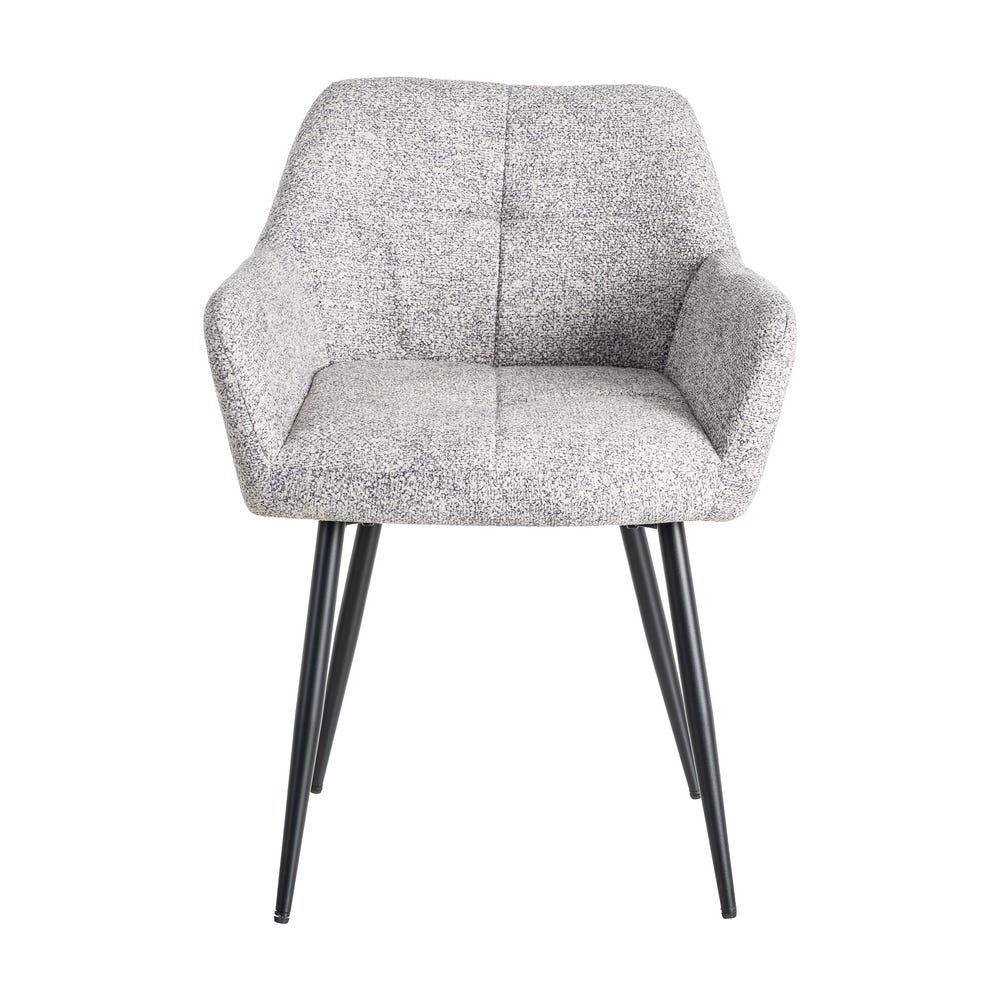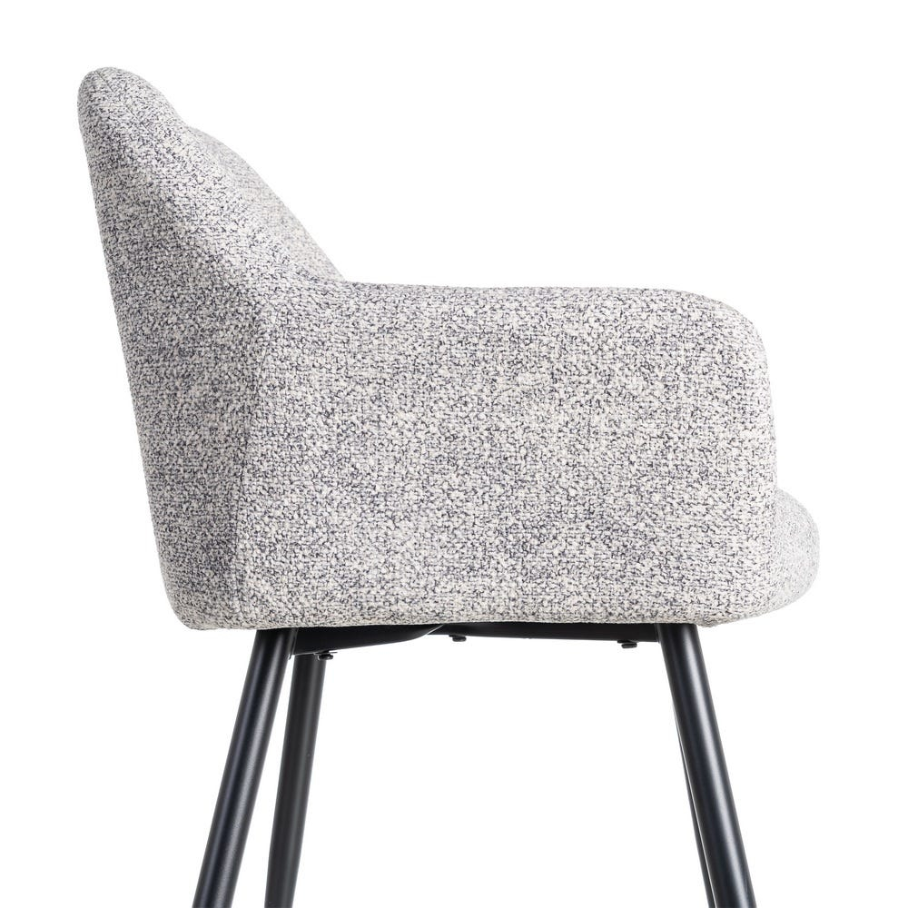 Set de 2 scaune dining si horeca din stofă gri alb melanj cu brațe integrate și picioare metalice conice oferă confort modern și fiabilitate pentru utilizare zilnică.