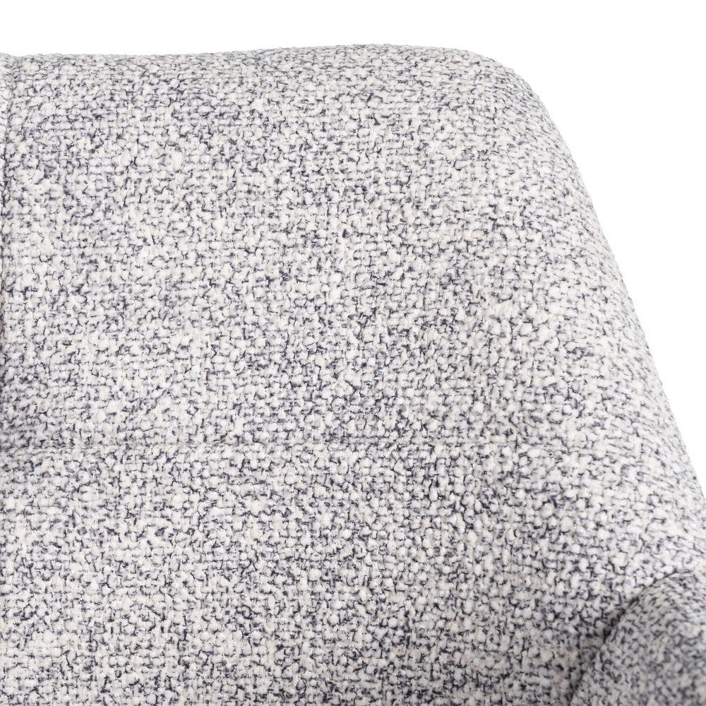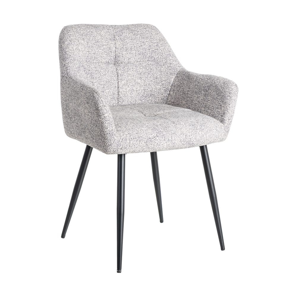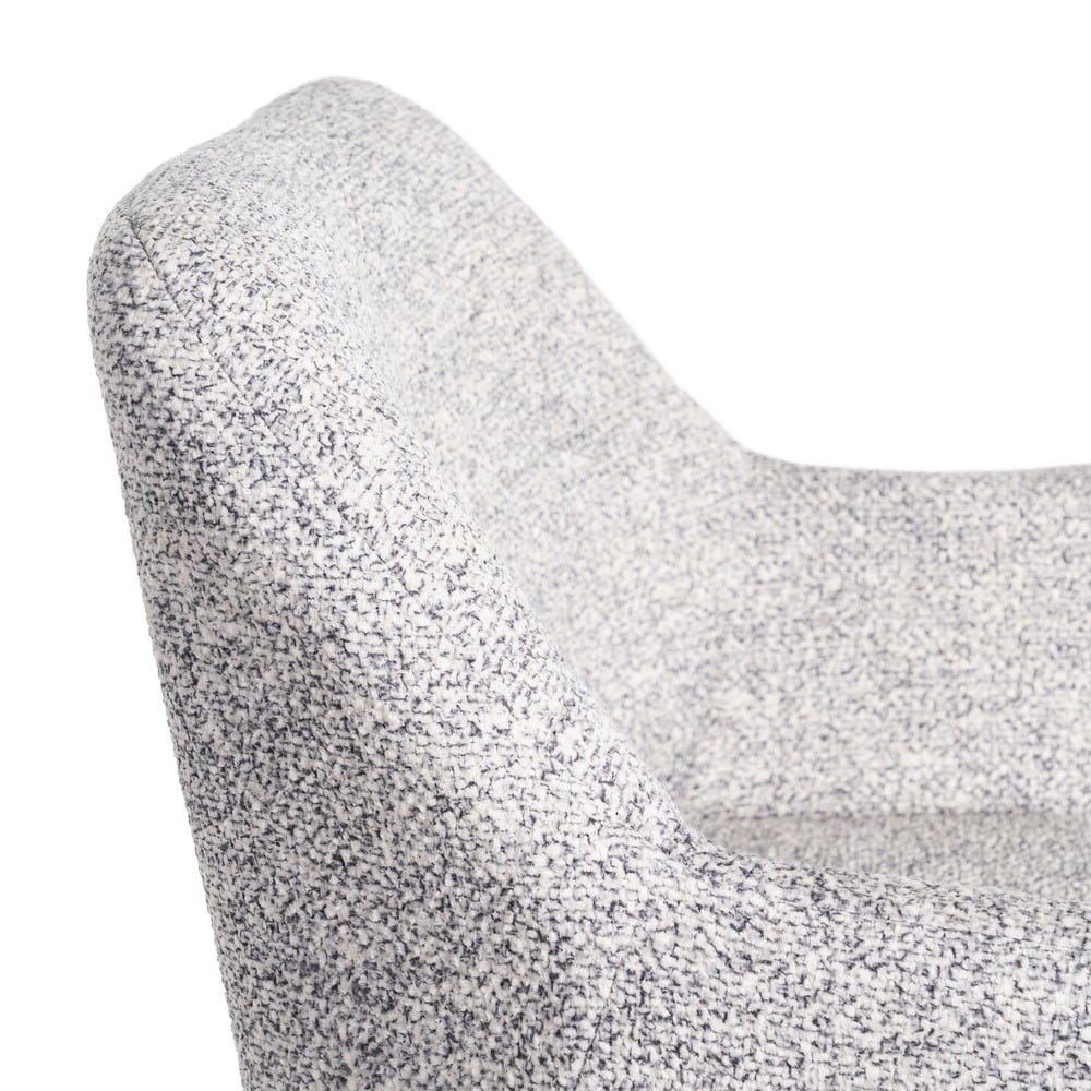 Silueta compactă cu spătar ușor curbat și brațe plăcut conturate susține natural postura la masă. Țesătura melanj gri alb se integrează discret în interioare contemporane și scandinave, păstrând un aspect curat în timp.