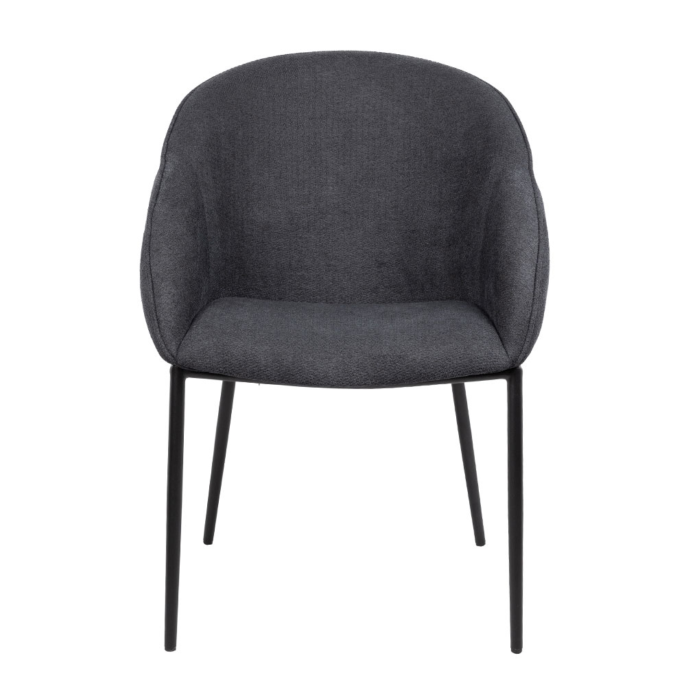 Set de 2 scaune cu brațe, tapițate în textil gri cu structură metalică neagră mată, perfecte pentru amenajări contemporane, dininguri minimaliste sau spații de birou elegante. Designul rotunjit al spătarului și al șezutului oferă o senzație de confort vizual și funcțional, făcând aceste piese ideale pentru utilizare zilnică sau recepții cu stil.