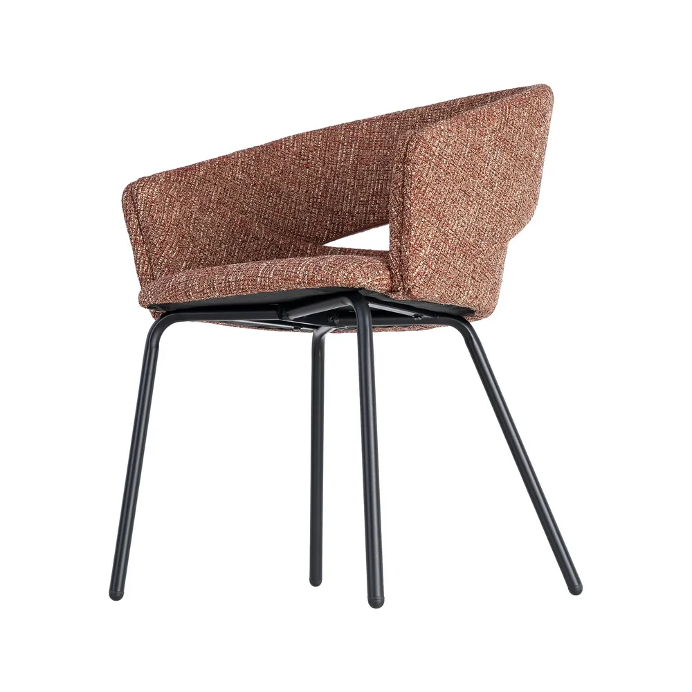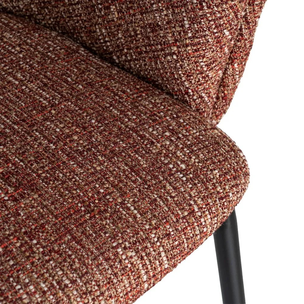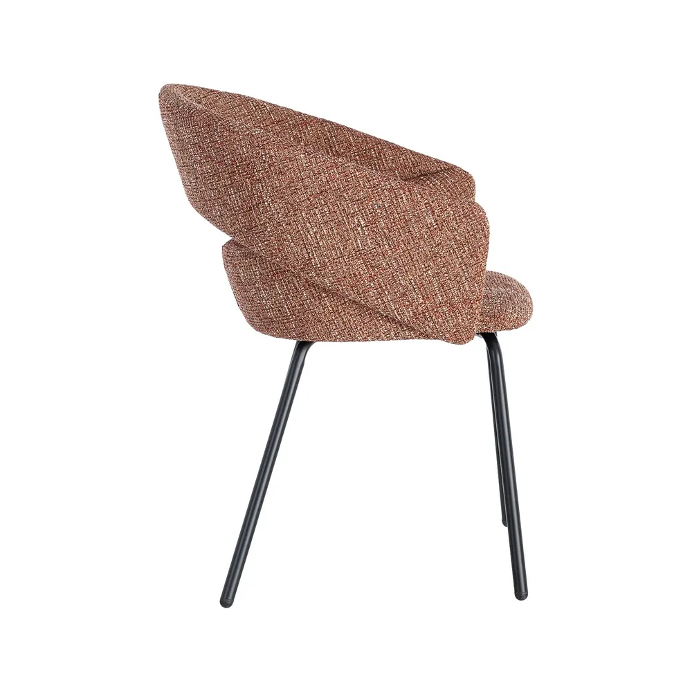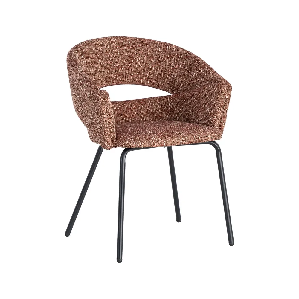 Acest set de scaune dining aduce în spațiu o notă caldă și plină de personalitate, prin nuanța cărămizie a stofei și forma rotunjită care invită la relaxare. Este genul de piesă care schimbă subtil atmosfera și face încăperea să pară mai primitoare, fără să devină încărcată.