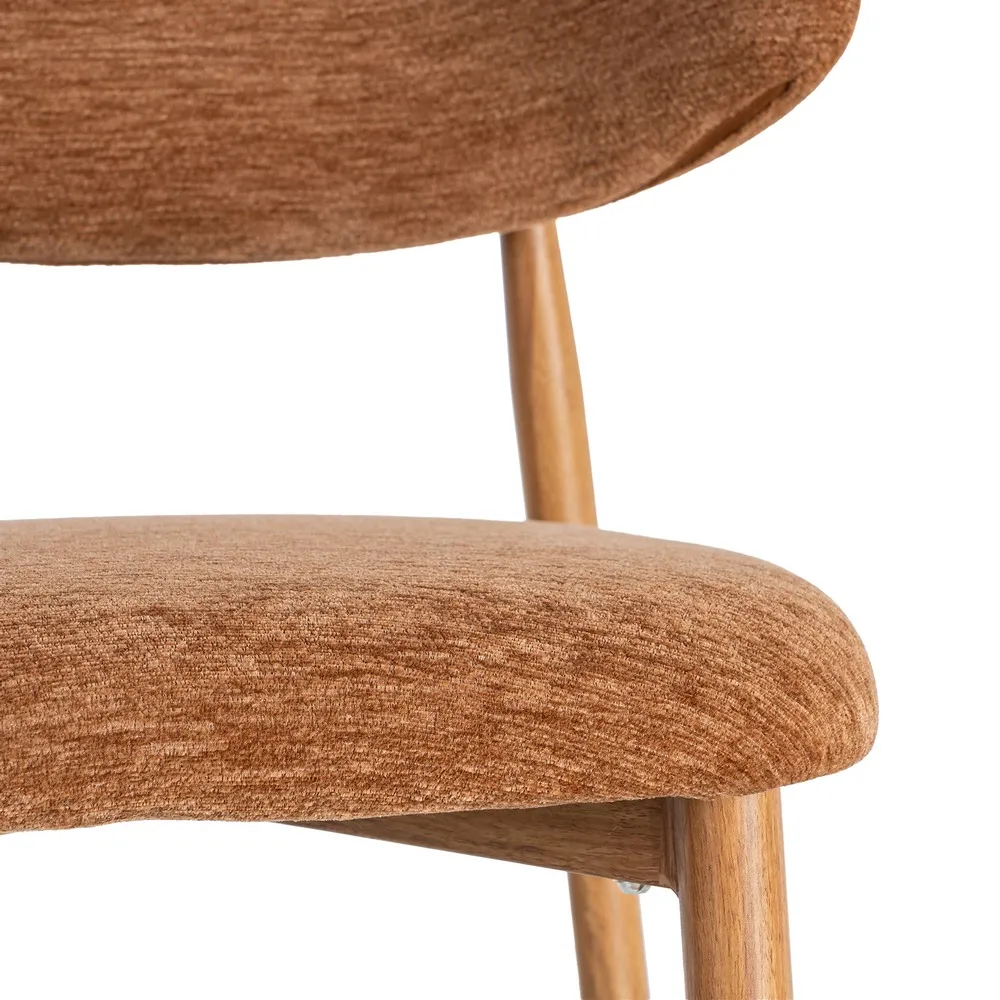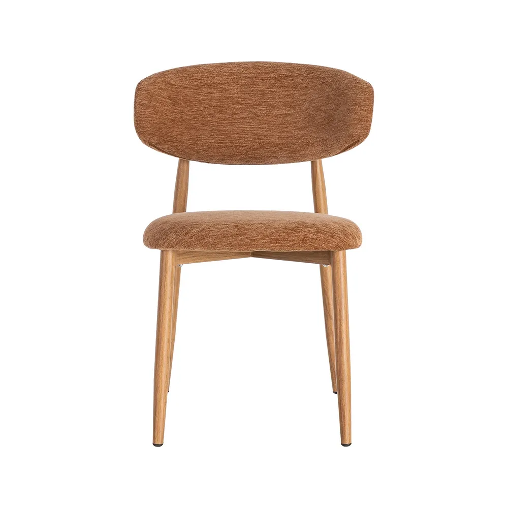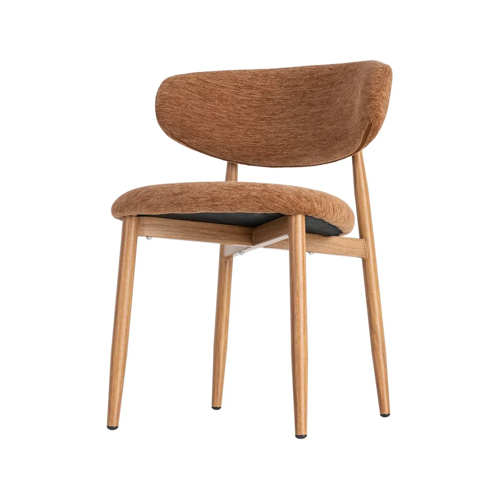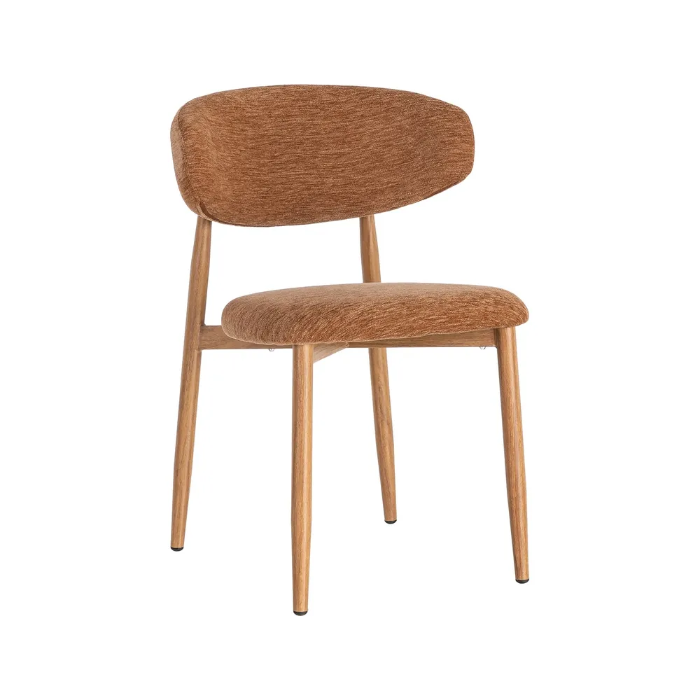 Acest set de scaune dining aduce în spațiu o senzație caldă și luminoasă, prin nuanța portocalie a stofei și liniile simple care inspiră relaxare. Este genul de piesă care face încăperea să pară mai prietenoasă și mai ușor de locuit, fără să încarce vizual.