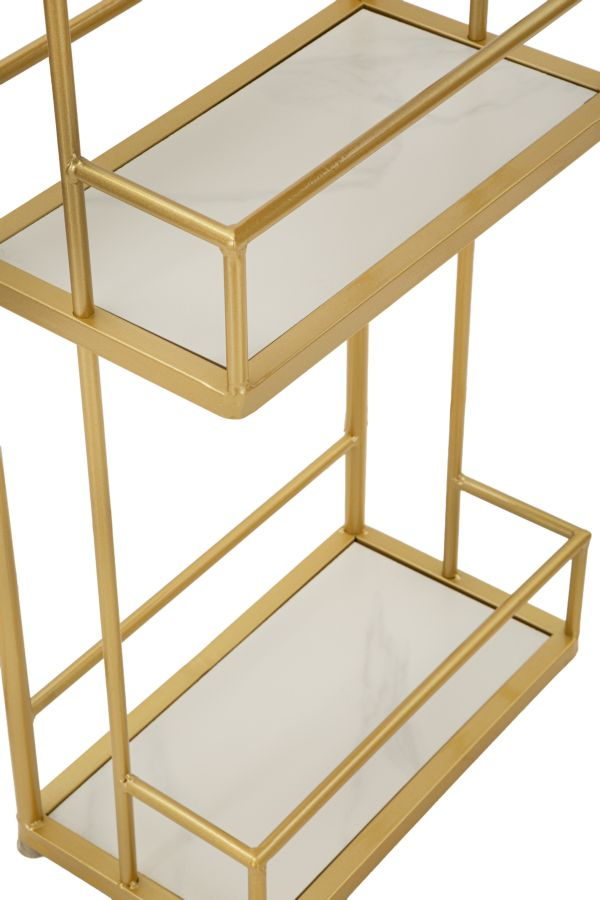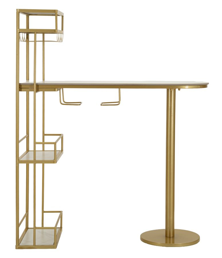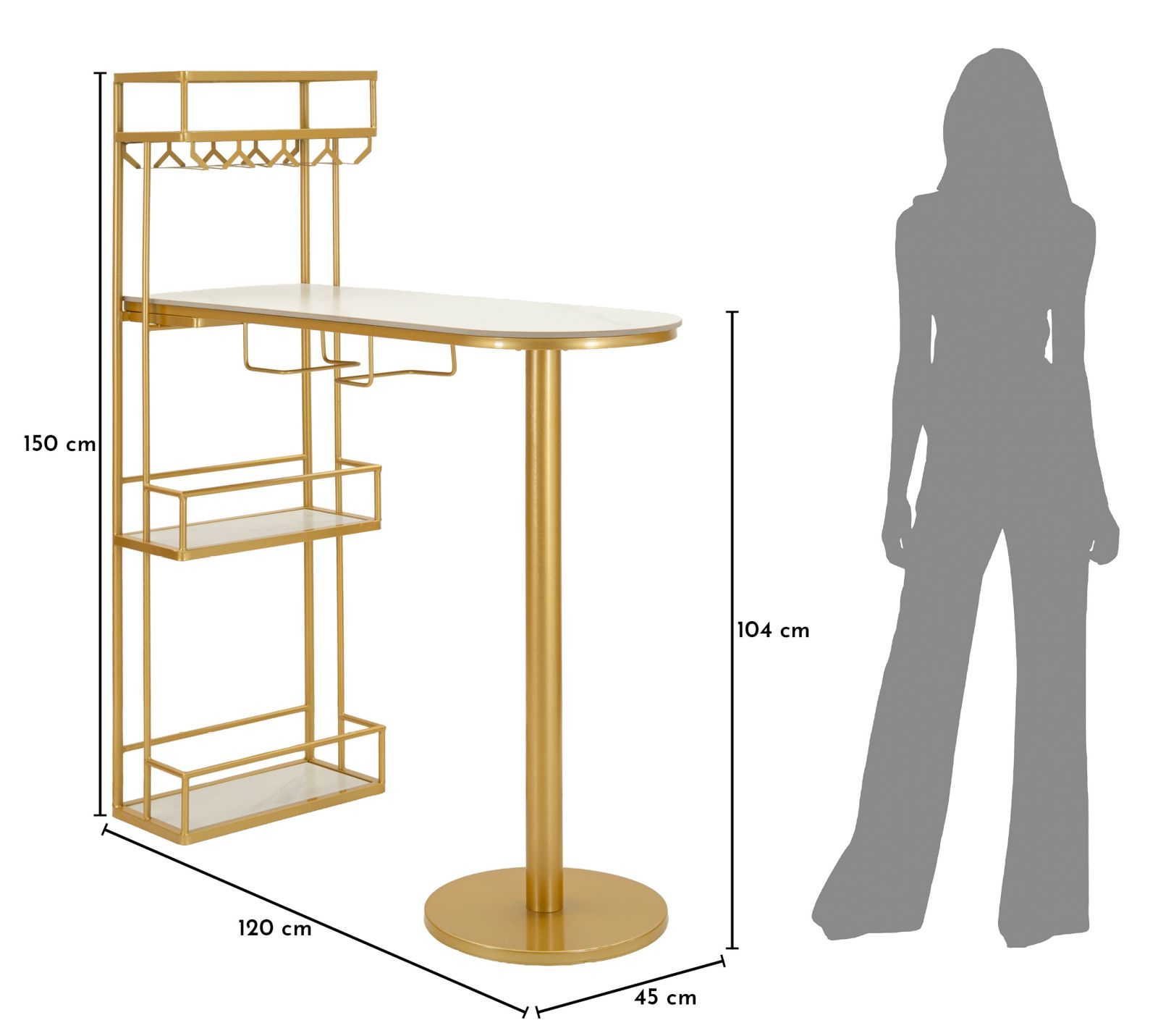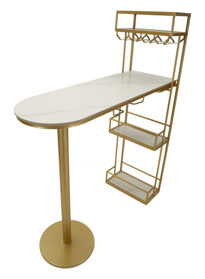 Masă bar cu blat din marmură artificială albă, structură metalică aurie și etajere pentru depozitare design modern 120 x 45 x 150 cm
