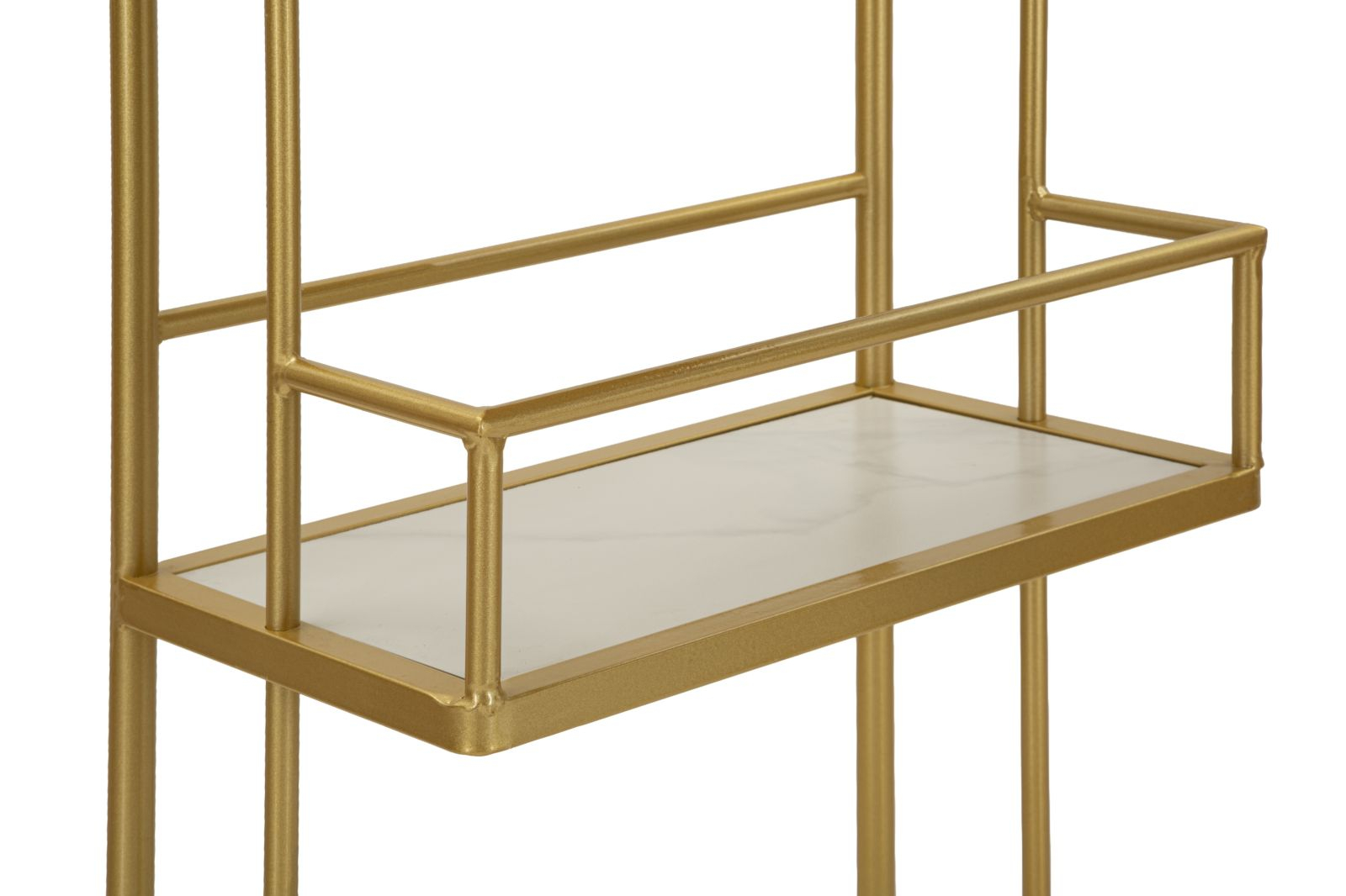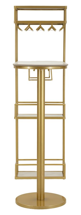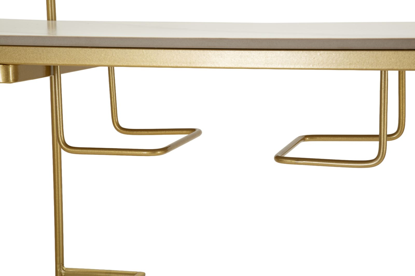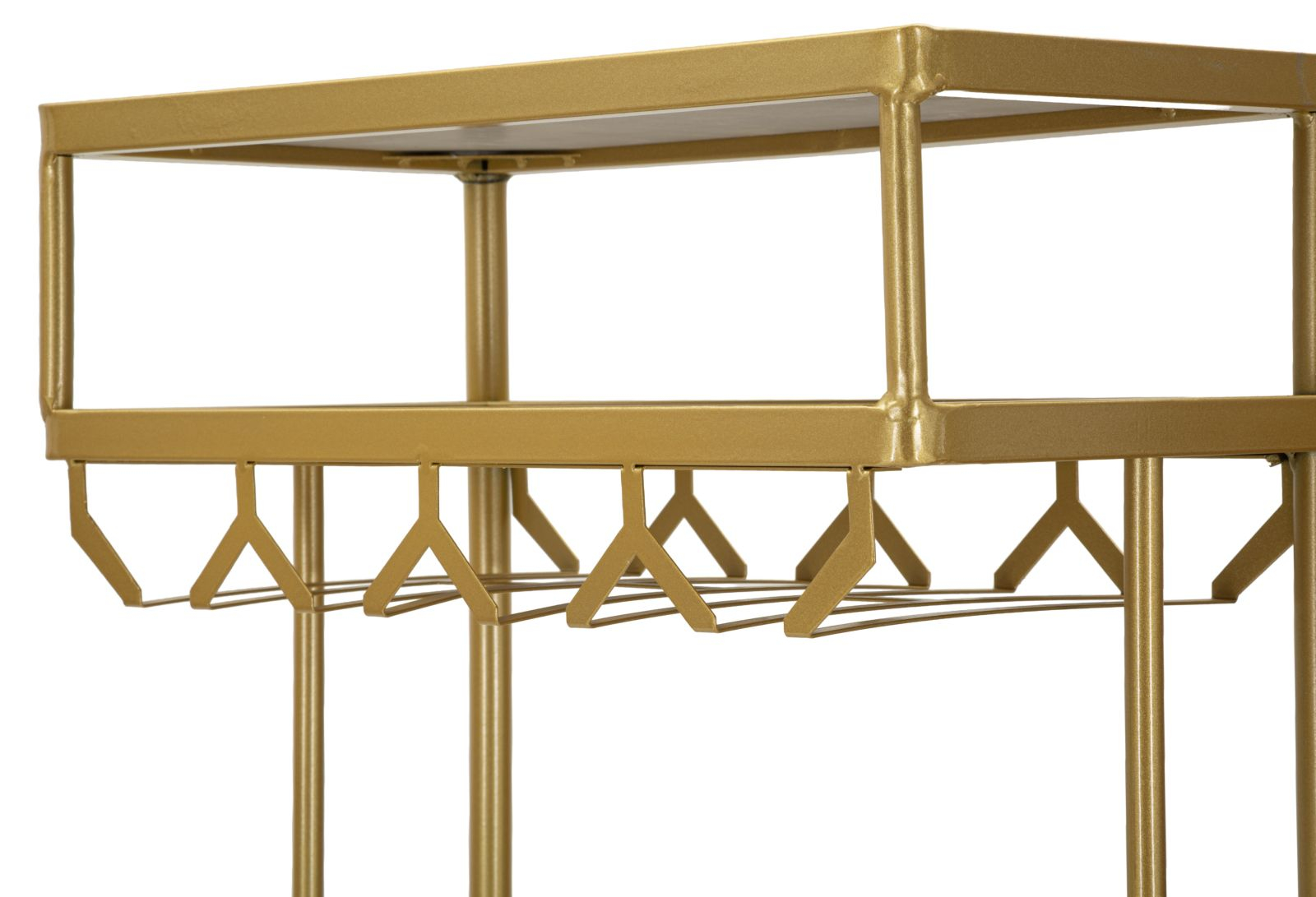 Structura verticală metalică include rafturi practice pentru depozitare și suporturi pentru pahare, oferind spațiu pentru organizarea sticlelor, accesoriilor de bar sau obiectelor decorative. Liniile subțiri și proporțiile echilibrate conferă piesei un aspect aerisit și modern.