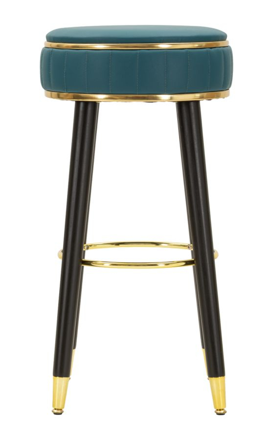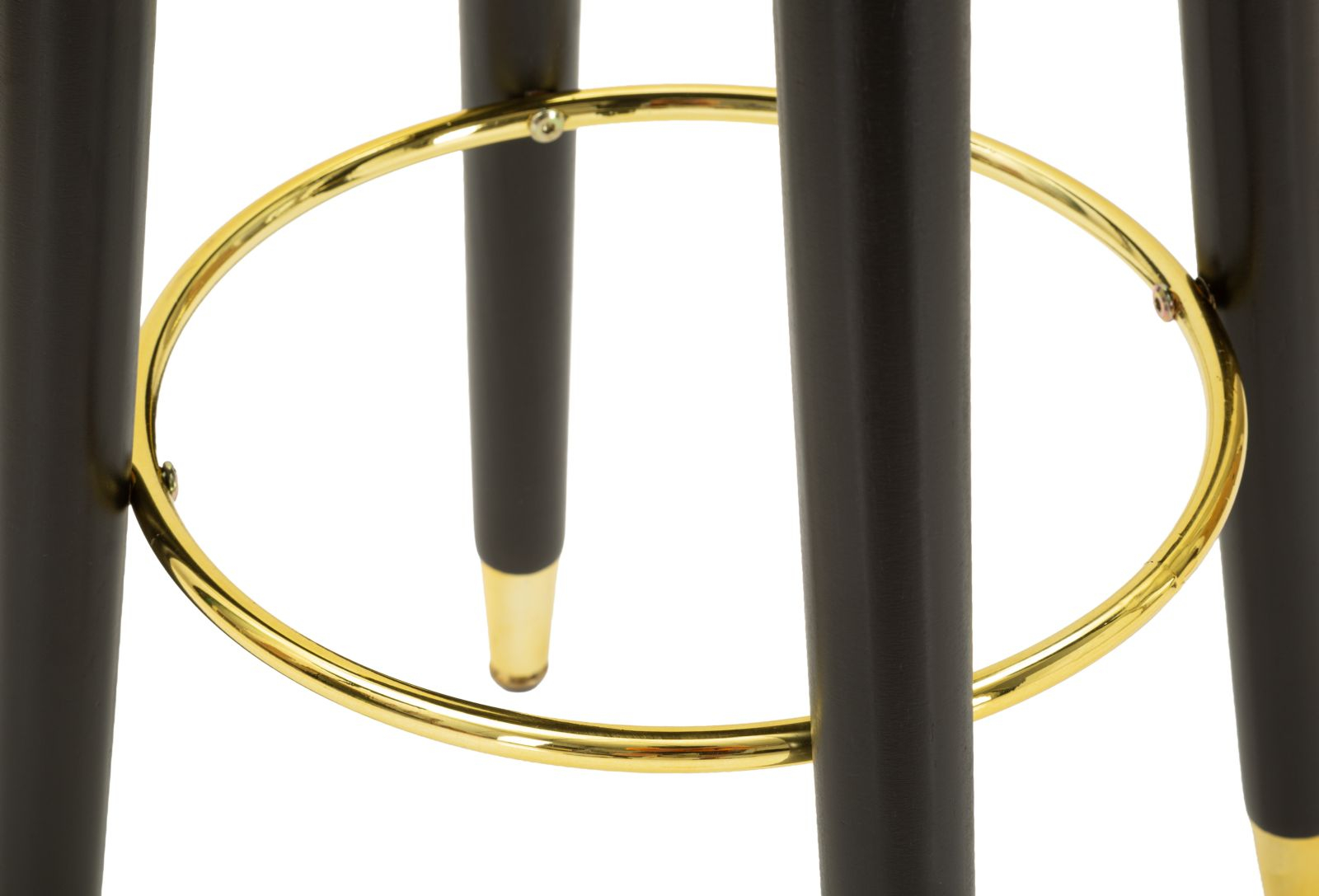 Șezutul rotund tapițat oferă confort și stil, fiind accentuat de inelul decorativ auriu care încadrează partea superioară. Picioarele negre, subțiri și elegante, sunt completate de terminații aurii ce adaugă un aer premium întregii piese.