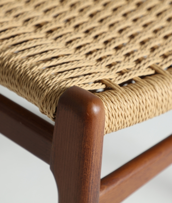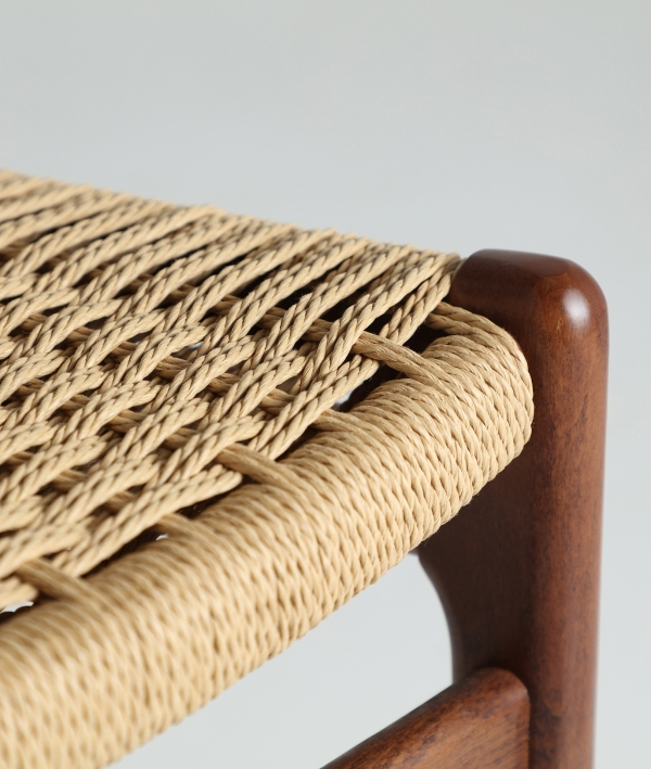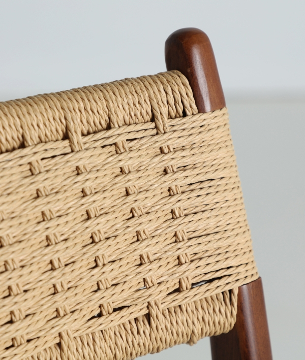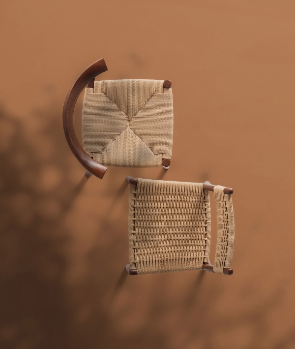 Scaunul WHEL impresionează prin liniile sale curate și prin structura solidă din lemn de fag, evidențiată de textura naturală și nuanța caldă a finisajului maro. Șezutul și spătarul împletite manual din funie bej adaugă un caracter artizanal autentic, completând armonios aspectul organic al piesei.