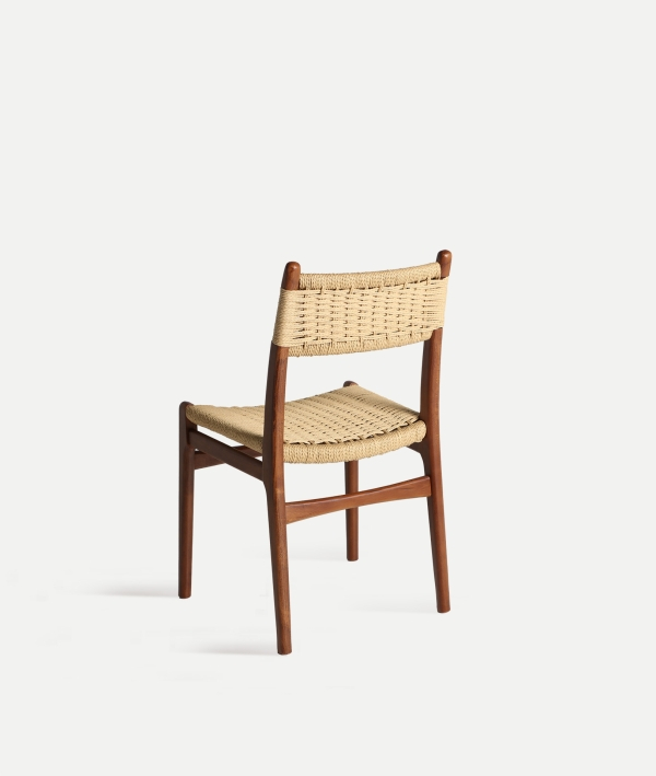 Scaun din lemn de fag maro cu șezut împletit din funie bej – o piesă care îmbină tradiția artizanală cu liniile moderne, oferind confort, stabilitate și o estetică naturală, ideală pentru dininguri și spații de socializare.