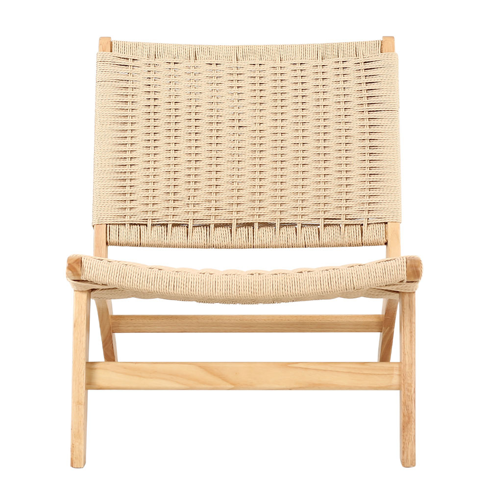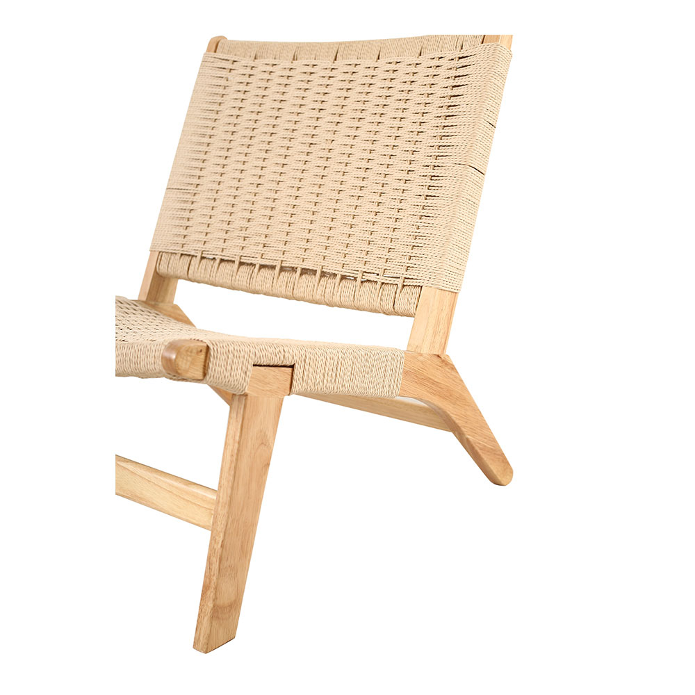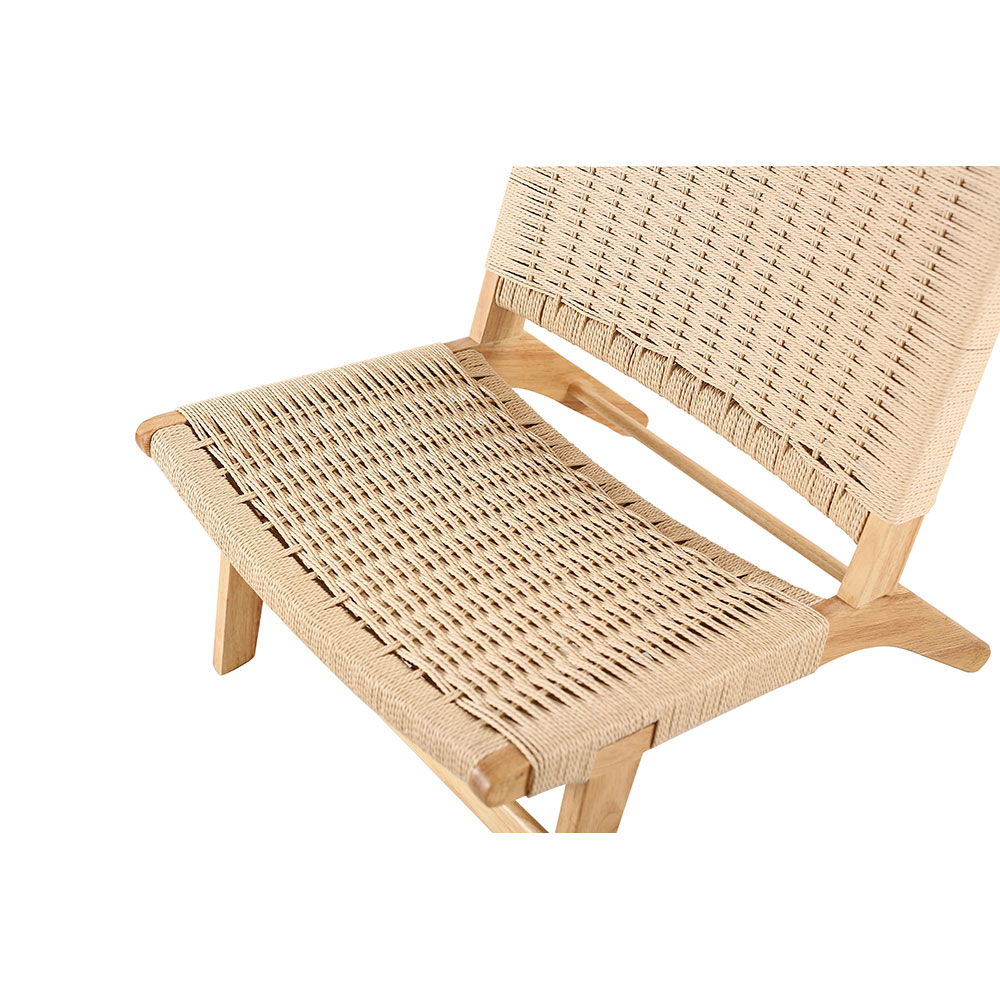 Structura din lemn masiv de rubberwood oferă stabilitate și rezistență în timp, păstrând în același timp un aspect natural și luminos. Șezutul și spătarul realizate din frânghie împletită adaugă textură și un detaliu artizanal rafinat, oferind totodată flexibilitate și confort la utilizare.