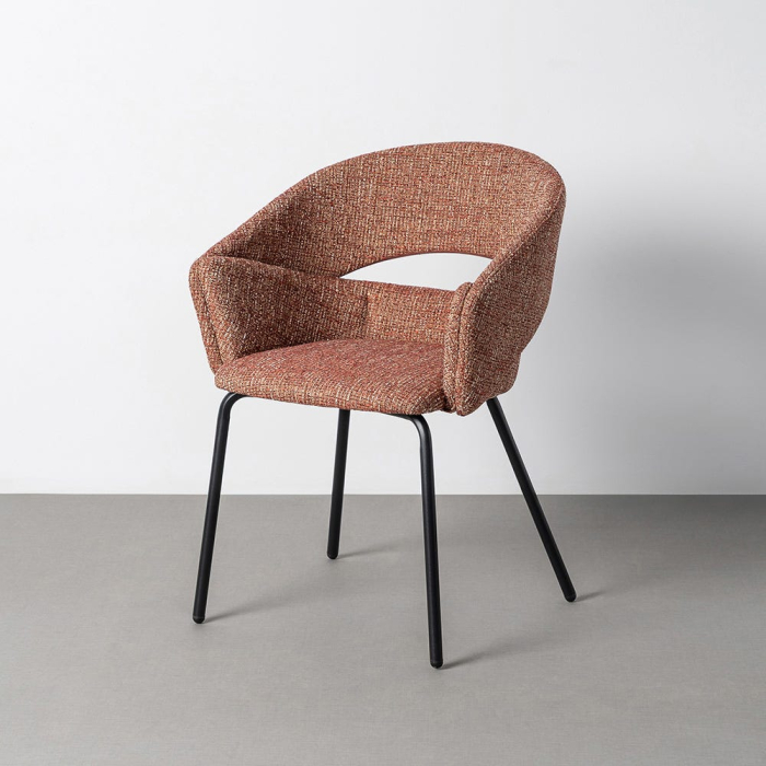 Acest set de scaune dining aduce în spațiu o notă caldă și plină de personalitate, prin nuanța cărămizie a stofei și forma rotunjită care invită la relaxare. Este genul de piesă care schimbă subtil atmosfera și face încăperea să pară mai primitoare, fără să devină încărcată.
