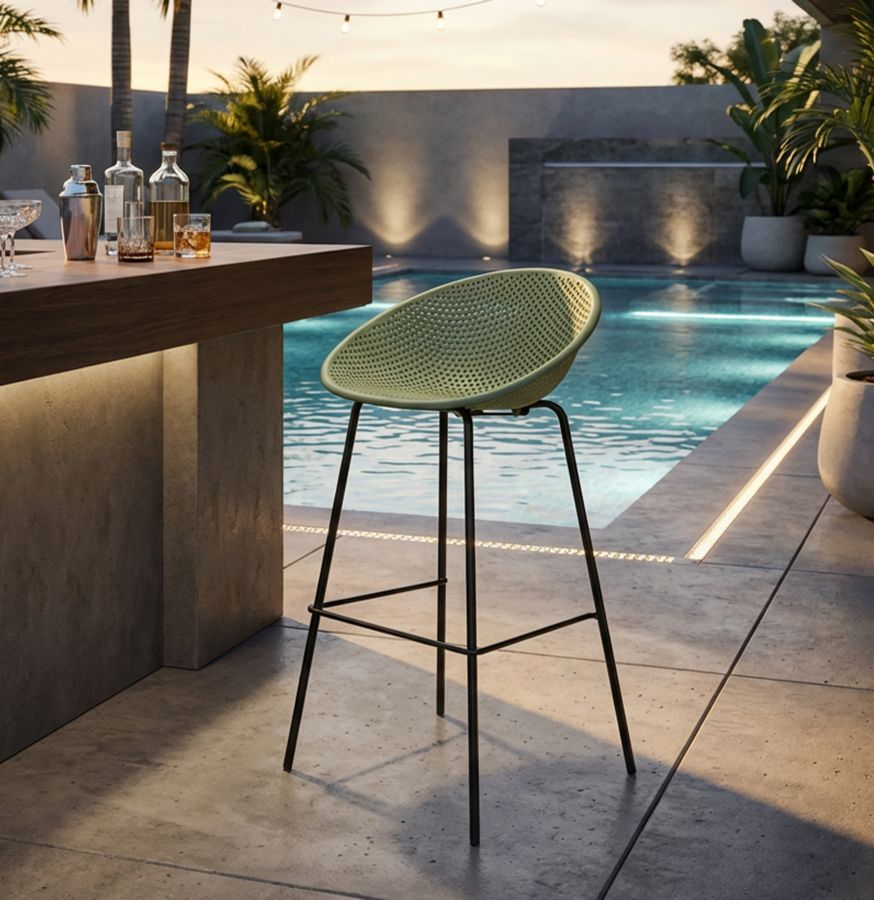 Nuanța de verde inspirată din natură aduce echilibru și prospețime teraselor, barurilor sau insulelor de bucătărie, fiind ideală atât pentru uz rezidențial, cât și pentru spații HoReCa. Forma ergonomică și textura perforată asigură confort și ventilație, iar suportul pentru picioare completează funcționalitatea.