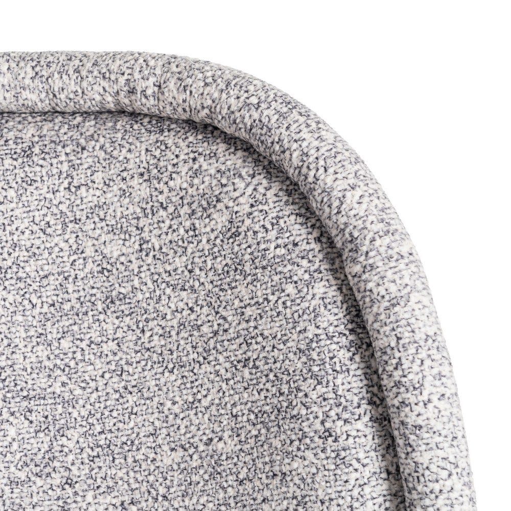 Spătarul curbat cu decupaj lombar relaxează postura, iar textura melanj camuflează foarte bine urmele de uzură. Picioarele conice negre oferă stabilitate și un profil suplu, ușor de integrat lângă mese dreptunghiulare sau rotunde.