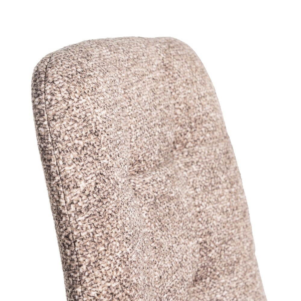 Șezutul și spătarul profilate asigură confort la mese prelungite, iar picioarele metalice stabile păstrează un profil suplu în jurul mesei. Nuanța de stofă taupe se combină ușor cu lemn natur, nuc, negru sau gri antracit, fiind o opțiune versatilă pentru proiecte rezidențiale și horeca.