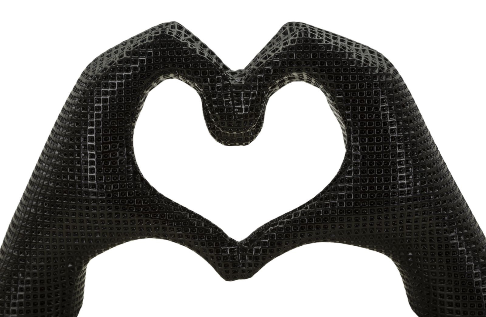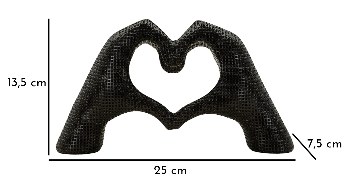 Această sculptură artistică reprezintă două mâini unite într-un gest delicat care conturează o inimă, simbol universal al iubirii și al legăturilor profunde. Realizată din rășină de calitate și finisată într-un negru intens, piesa se remarcă prin designul său contemporan și mesajul emoțional pe care îl transmite.