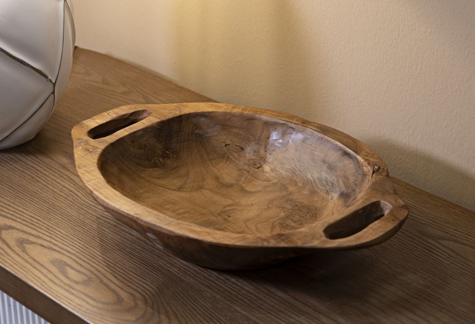 Acest bol realizat din lemn de tec reciclat se distinge prin aspectul său natural și autentic, fiind o piesă unică ce aduce în prim-plan frumusețea fibrelor lemnoase. Formele organice și tonurile calde ale lemnului creează o atmosferă primitoare, iar detaliile naturale transformă fiecare bol într-un obiect cu personalitate proprie, care nu se repetă în serie.