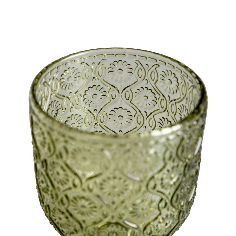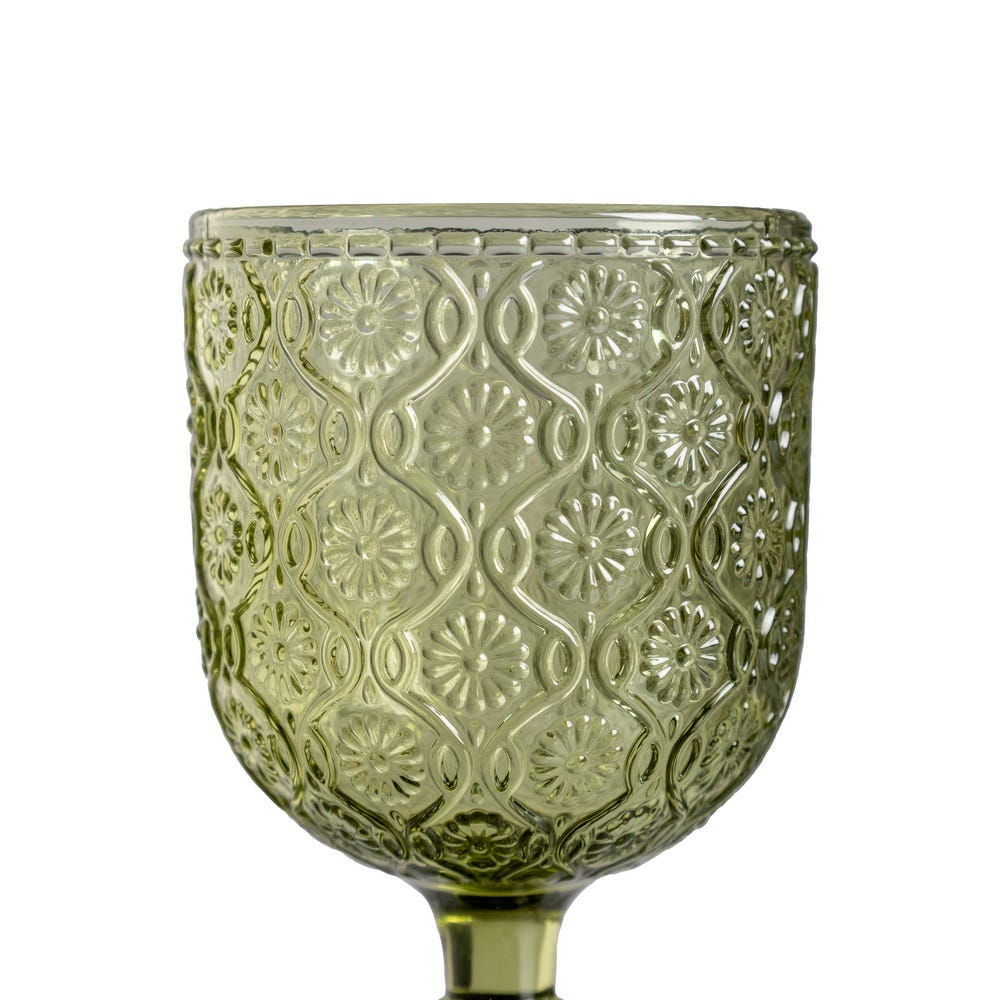 Set de 6 pahare de vin verzi din sticlă soda-lime cu model floral embosat, rezistente și elegante, perfecte pentru servirea vinului la mese festive sau întâlniri relaxante acasă.