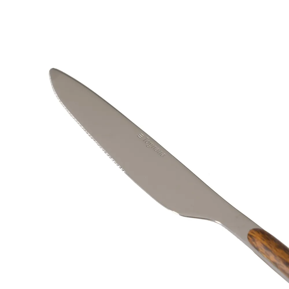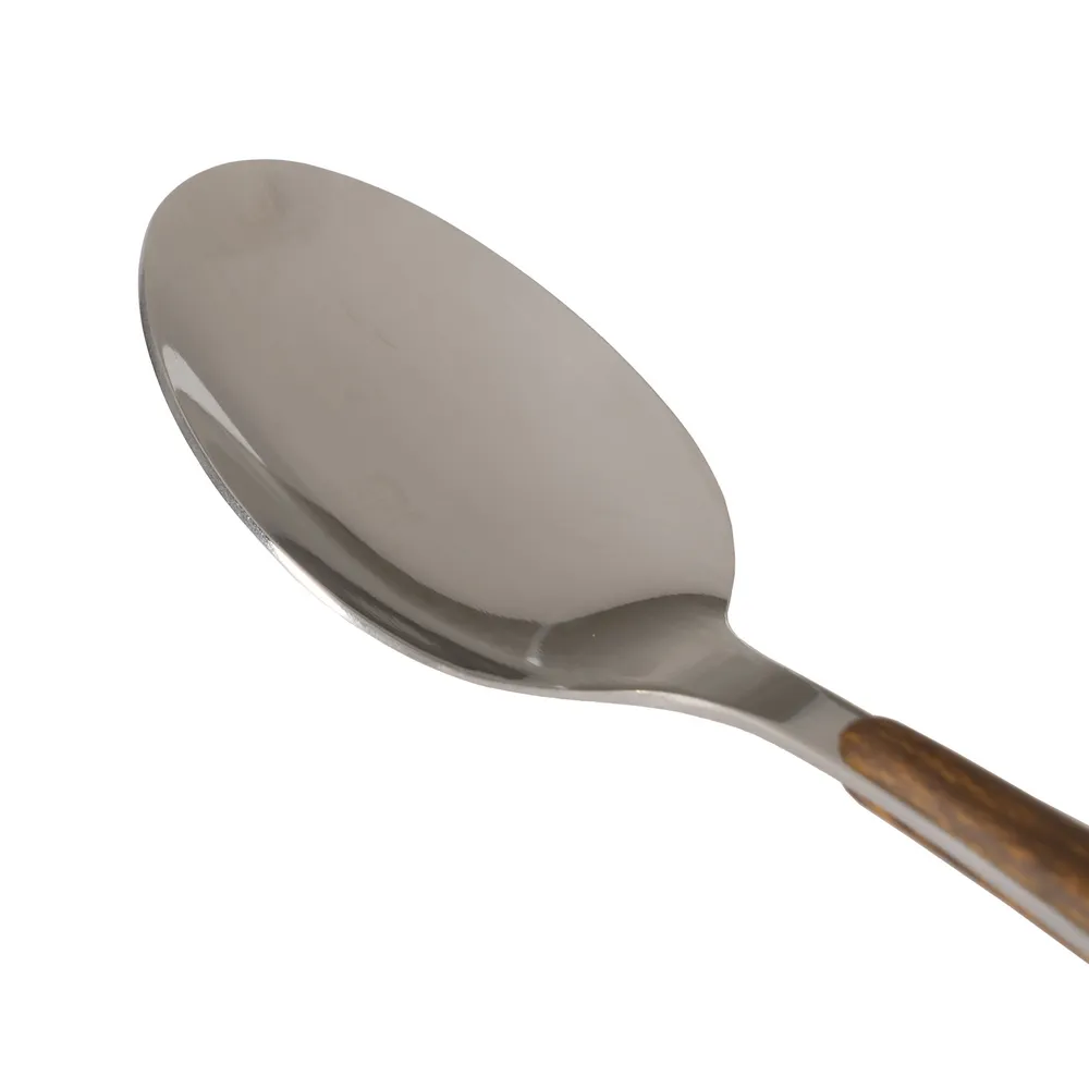 Set elegant de tacâmuri inox cu 24 piese și mânere maro. Tacâmuri de calitate spaniolă, perfecte pentru mese festive și de zi cu zi. Compatibile cu mașina de spălat vase.