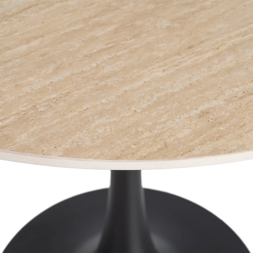 Blatul este realizat din piatră sinterizată bej cu efect de marmură travertin și grosime de 11 mm, iar structura și piciorul sunt fabricate din fier de culoare neagră.