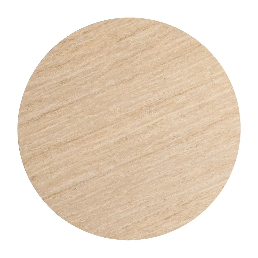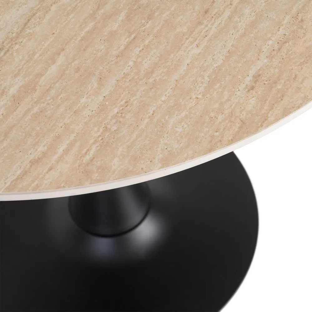 Blatul rotund bej are o grosime de 11 mm și o suprafață netedă cu aspect de marmură travertin, evidențiind textura specifică acestui finisaj. Diametrul de 80 cm oferă proporții echilibrate și utilizare confortabilă atât în spații rezidențiale, cât și în cele comerciale.