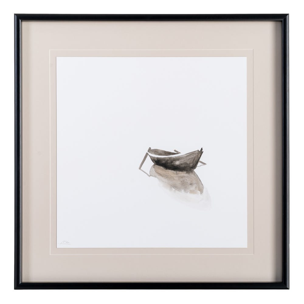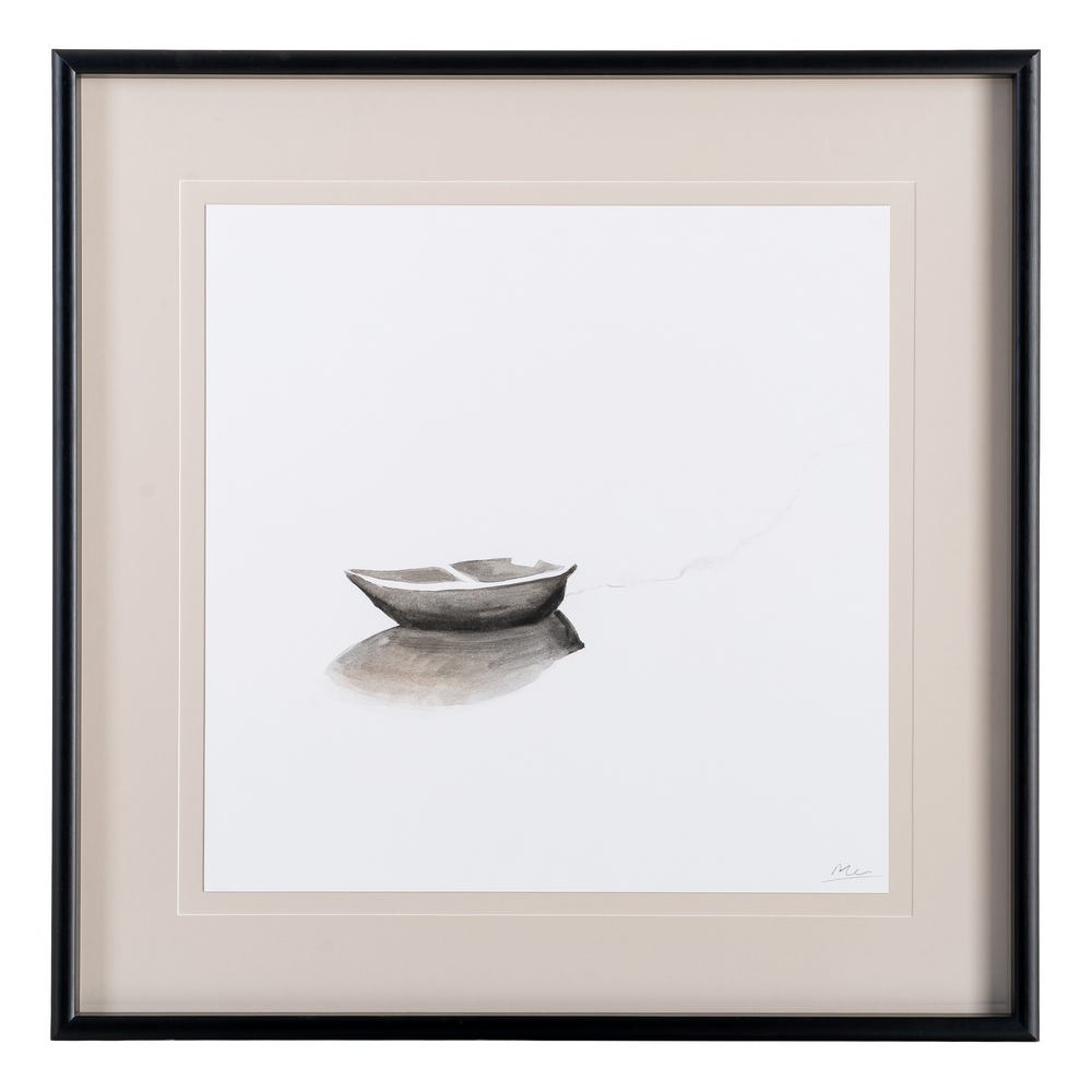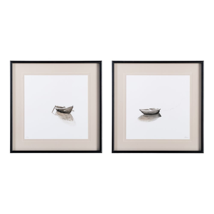 Setul 2 tablouri cu bărci pictate manual cu ramă din lemn și sticlă aduce pe perete compoziții minimaliste, cu mult spațiu negativ. Tonurile deschise și liniile fine creează un efect aerisit și relaxant. Dimensiunea pătrată le face potrivite pentru pereți principali din living sau dormitor.