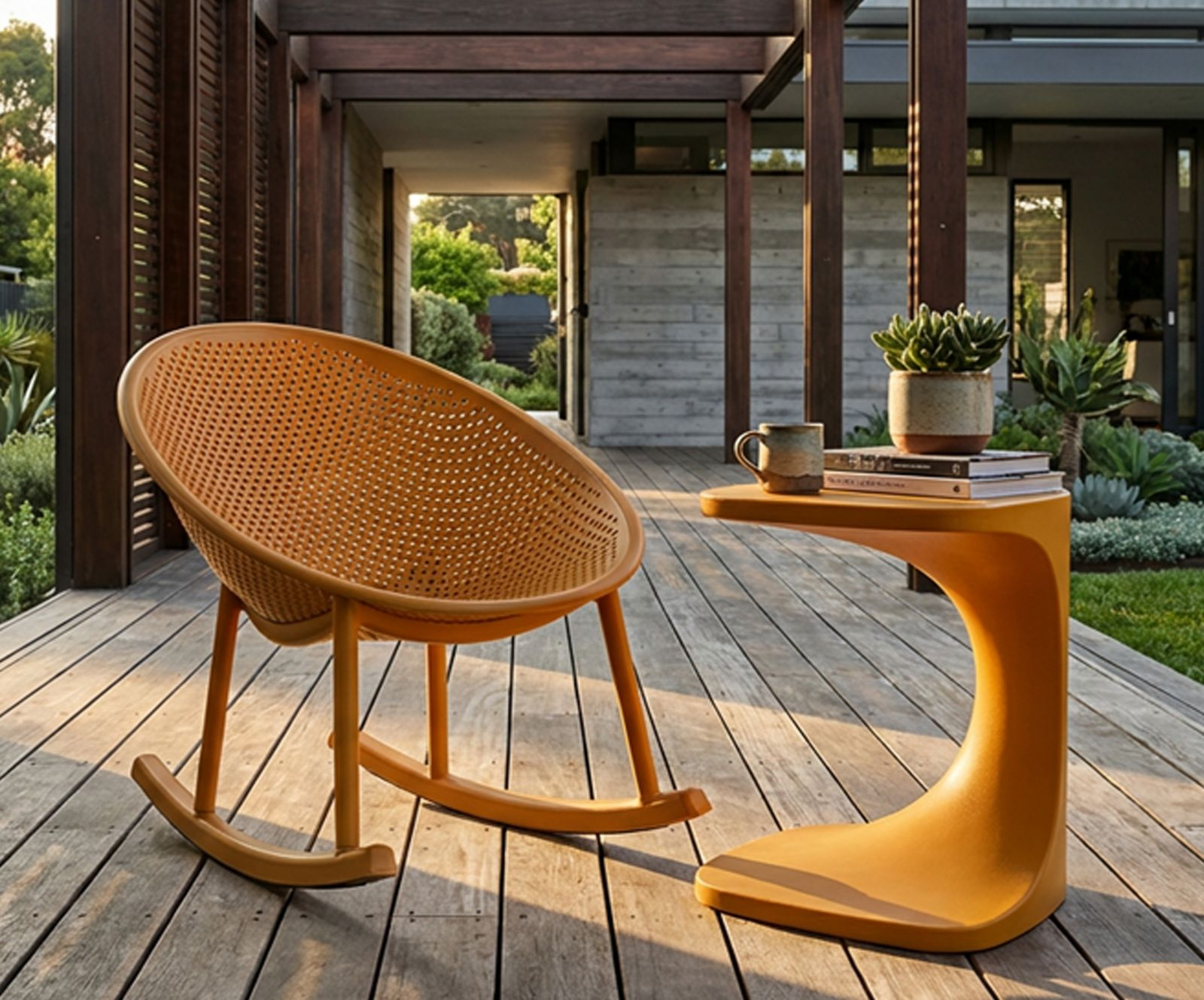 Forma ergonomică și textura perforată permit o bună ventilare și oferă susținere confortabilă, iar baza curbată asigură un balans lin și relaxant. Ideal pentru zone lounge, terase moderne sau spații HoReCa care pun accent pe design și experiență.