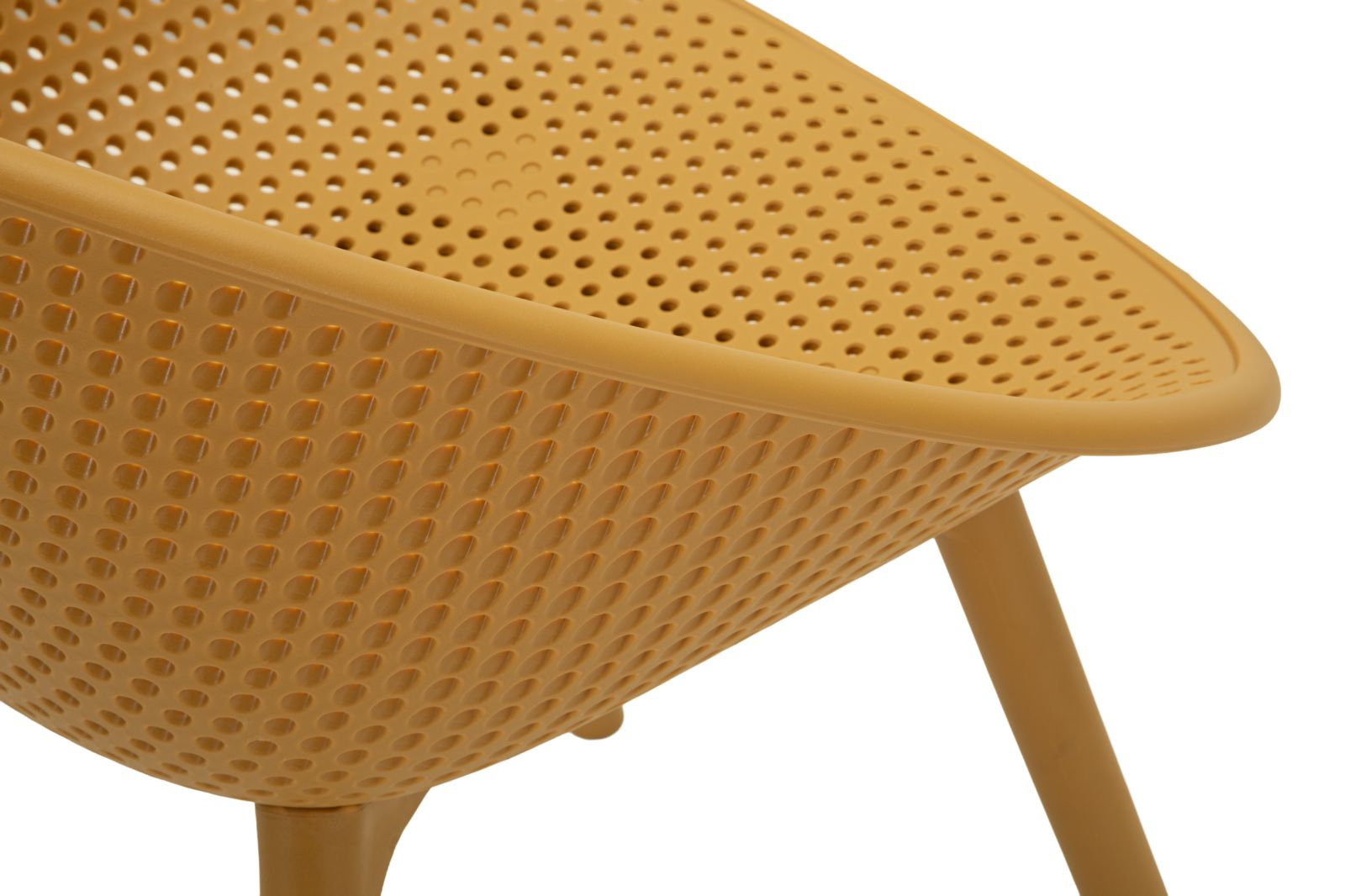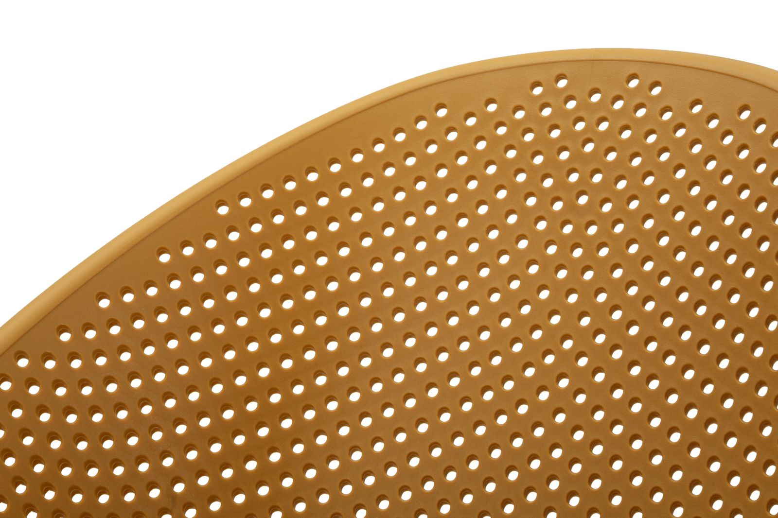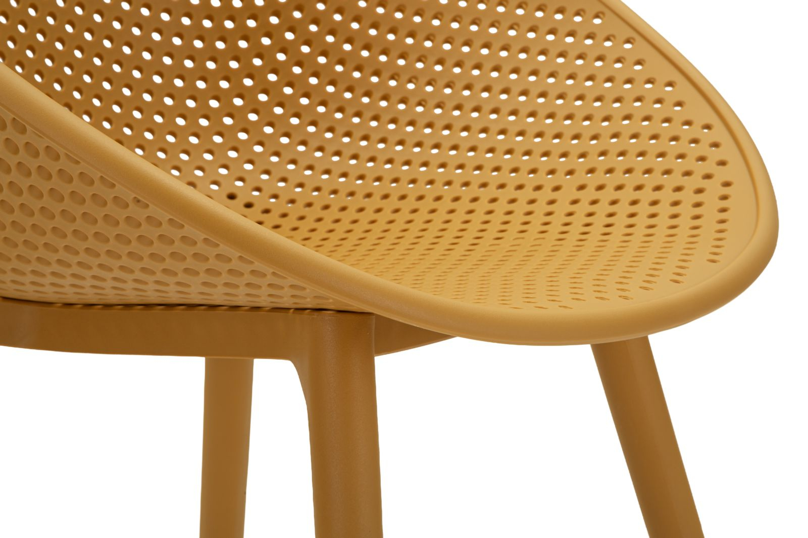 Realizate din plastic rezistent, scaunele impresionează prin spătarul rotunjit și textura perforată, care oferă un plus de confort și o bună ventilare în zilele călduroase. Nuanța muștar adaugă personalitate și un aer contemporan, transformând orice spațiu într-un ambient primitor și plin de stil.