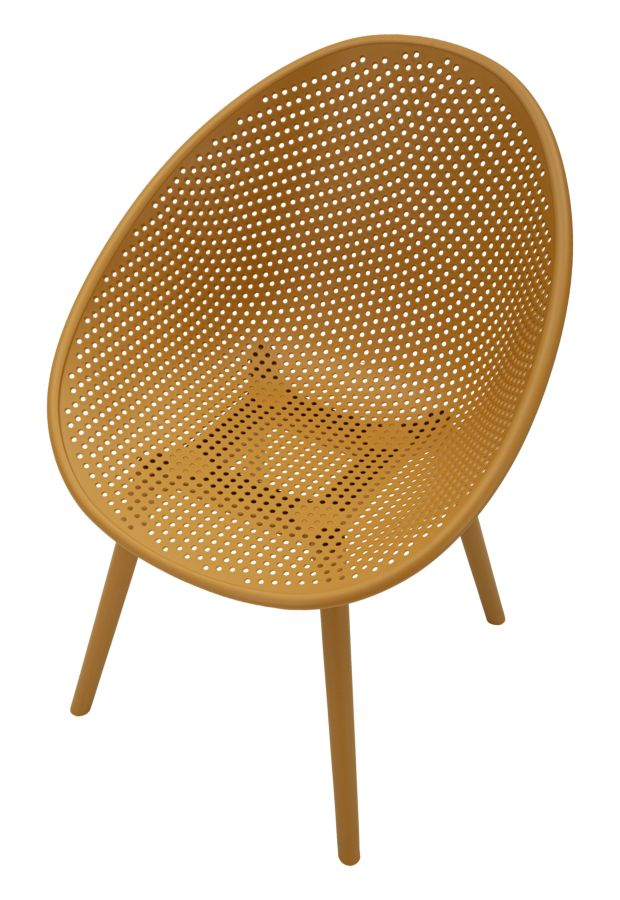 Formă îmbrățișoare și textură perforată pentru un confort natural. Scaunul Ibiza Senape aduce căldură și energie atât în spațiile interioare, cât și pe terase sau în grădini, îmbinând designul modern cu lejeritatea vizuală.