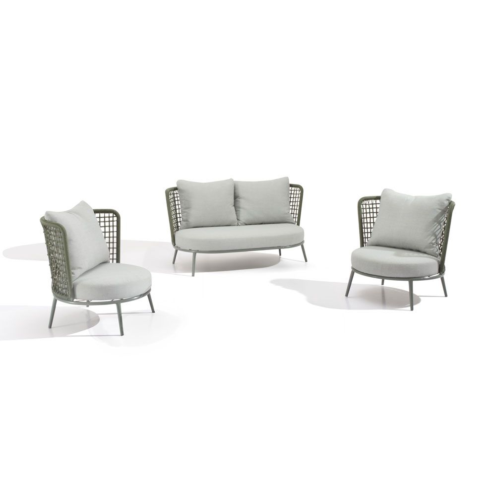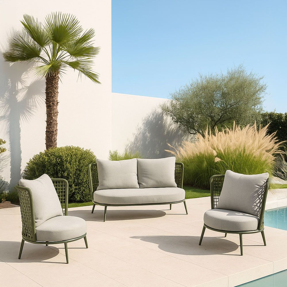 Setul de terasă POLO în nuanță olive aduce un aer proaspăt, natural și contemporan în orice spațiu exterior. Designul rotunjit și împletitura aerisită creează o atmosferă relaxantă, perfectă pentru terase moderne, grădini minimaliste sau zone lounge elegante.