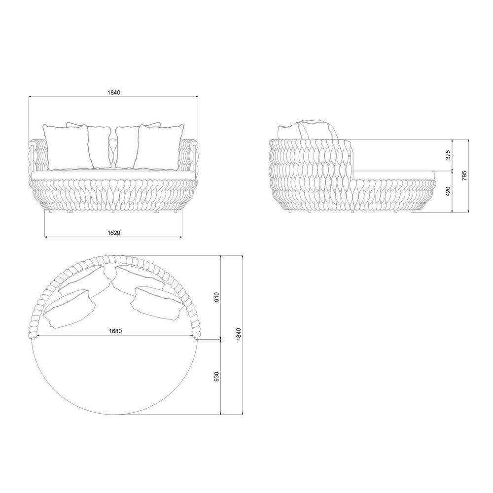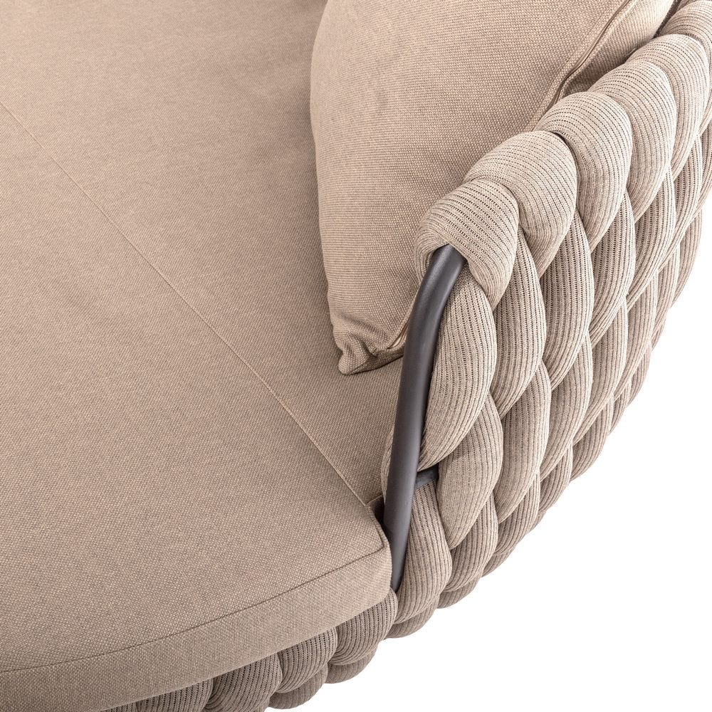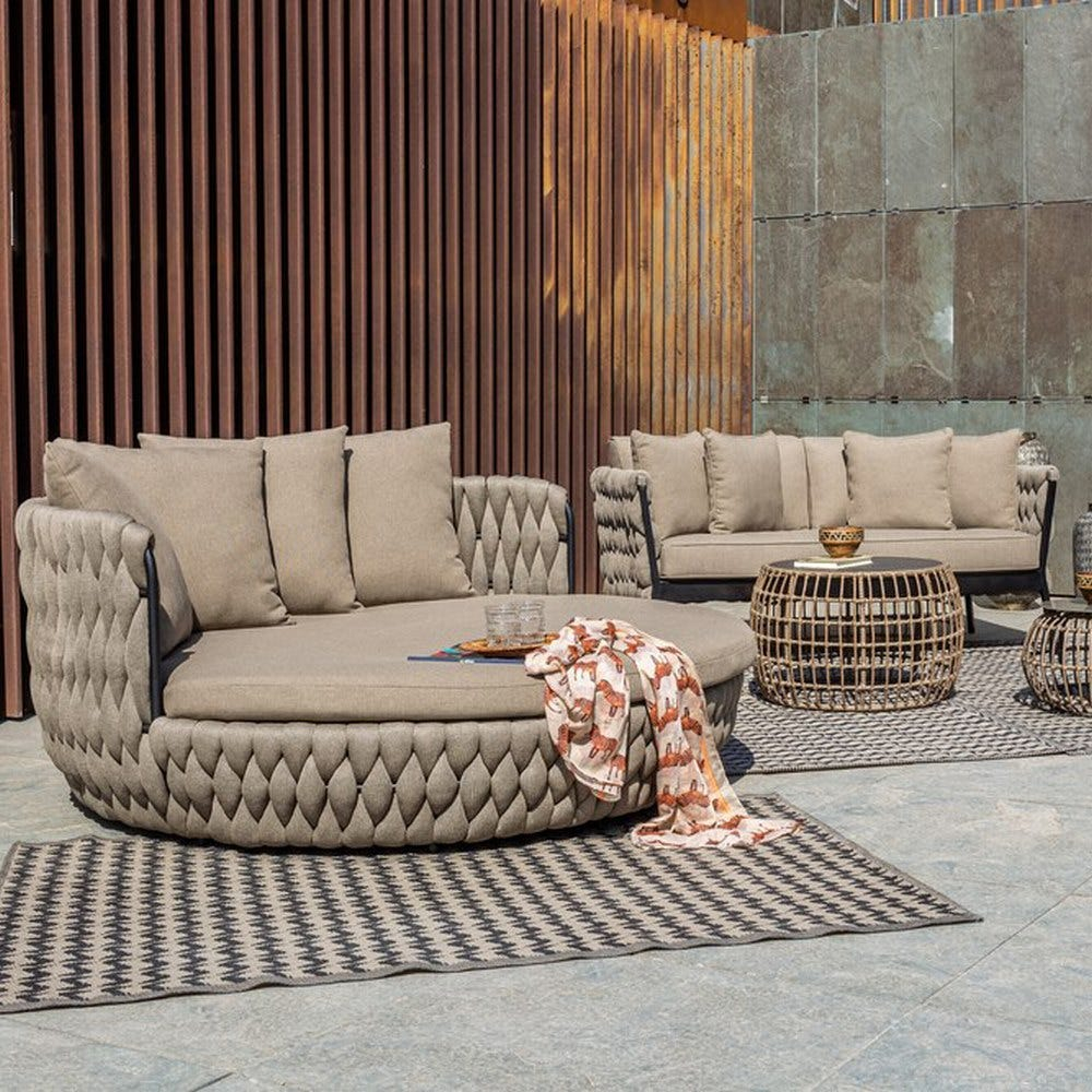 Patul rotund REBECCA este piesa-statement care transformă orice spațiu de exterior într-un sanctuar al relaxării. Cu o formă generoasă, un design textil sofisticat și detalii lucrate manual, această piesă aduce o senzație de lux tactil în grădină sau pe terasă.