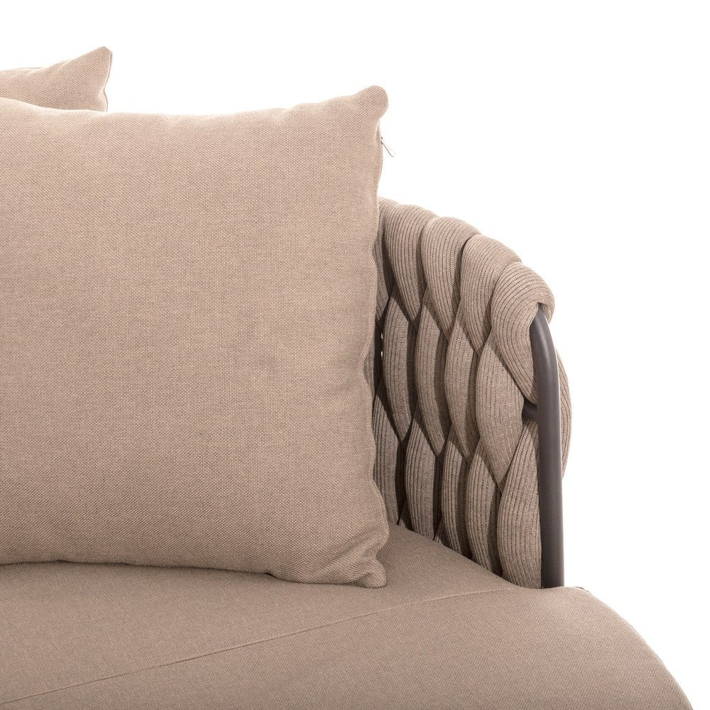 Structura de bază este realizată din aluminiu vopsit, ușor și rezistent, îmbrăcat complet într-o țesătură de olefină împletită, într-o nuanță taupe caldă și naturală. Materialul este rezistent la apă, mucegai, pete și raze UV, rămânând elegant și ușor de curățat în timp. Pernele decorative mari, de 55x55 cm, sunt incluse și au huse detașabile cu fermoar, pentru o întreținere simplificată.