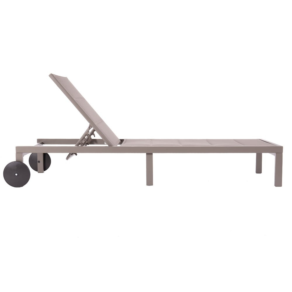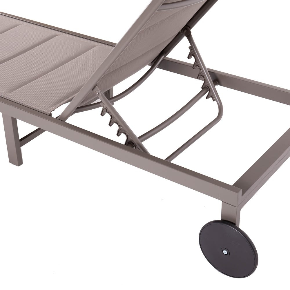 Zona de ședere este acoperită cu textilenă 2x1 – un material respirabil, rezistent la apă și raze UV, care oferă o susținere fermă dar confortabilă, chiar și fără perne. Un avantaj major îl reprezintă roțile mari integrate, care permit mutarea rapidă a șezlongului fără efort, fiind ideal în spații ce necesită reconfigurare frecventă.